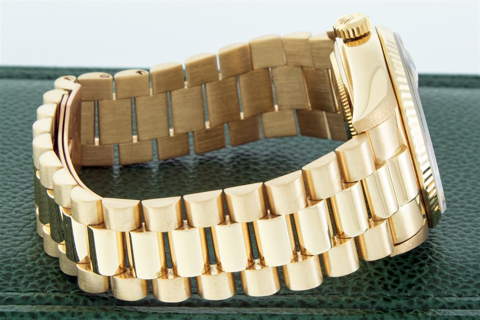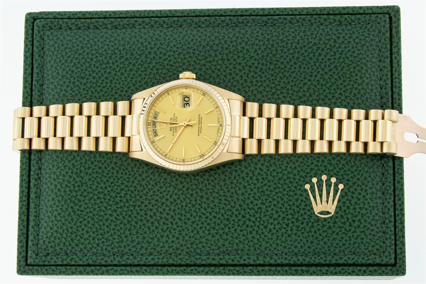 One Mens Pre Owned Quickset Rolex Day Date 18K Yellow Gold President Polished, Serviced & Electronically Tested, Rolex 18K Yellow Gold Case: 36mm, Rolex 18K Yellow Gold Crown, Rolex Bezel: 18K Yellow Gold Fluted Bezel. Custom Crystal: New Scratch Resistant Synthetic Sapphire Cyclops Lens. Rolex Movement: Automatic Quickset Winding Movement Caliber 3055. Rolex Dial: Champagne Index With Roman Track & Lumi Dots. Date Window: 3 O'Clock Position, Day Display: 12 O'Clock Position, Single Quickset, Model: Day Date President. Condition: G-6 Extra Fine. Rolex Bracelet: 18K Yellow Gold President Band With Hidden Clasp, Bright & Satin Polish. 7.0 Inch Length, Standard President Clasp, With Rolex Logo.