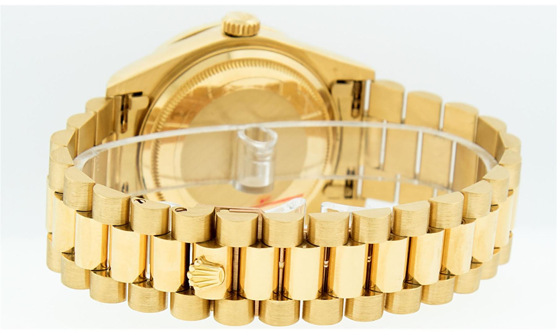 One Mens Rolex Day Date 18K Yellow Gold President Polished, Serviced & Electronically Tested, 18K Yellow Gold Case: 36mm, 18K Yellow Gold Crown, Custom Bezel: New 18K Yellow Gold Channel Set + Ruby Diamond Bezel, Diamond + Stone Count: 52 Diamonds + 4 Rubies On Bezel. Total Weight 1.30 Carat, Clarity: SI-VS, Color: G to H. Custom Crystal: New Scratch Resistant Synthetic Sapphire Cyclops Lens. Custom Hands: New Luminescent Hands. This Watch Has Been Serviced Time Tested And Is In Excellent Condition It Is Free Of All Scratches And Dents. Movement: Automatic Winding Movement Caliber 3055. Dial: Champagne Index With Roman Track & Lumi Dots. Date Window: 3 O'Clock Position Date Display, Day Window: 12 O'Clock Position Date Display. Quickset, Model: Day Date President. Condition: G-6 Extra Fine The Watch Is In Very Good Condition Free Of All Scratches And Dents. Bracelet: 18K Yellow Gold President Band. Bright Polish. 7.0 Inch Length, Standard Hidden President Clasp President Band, With Rolex Logo. This Watch Comes With A Rolex Box & Appraisal.