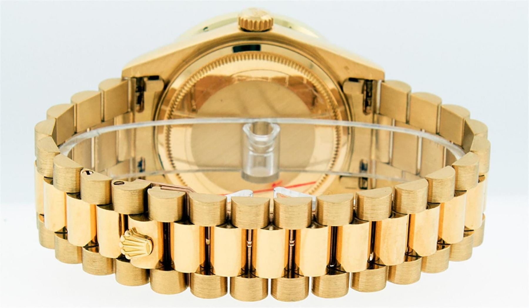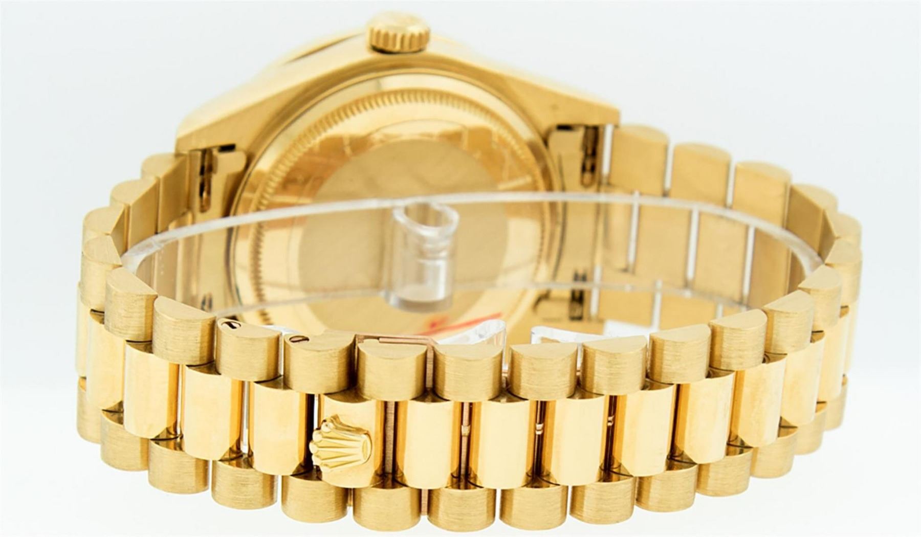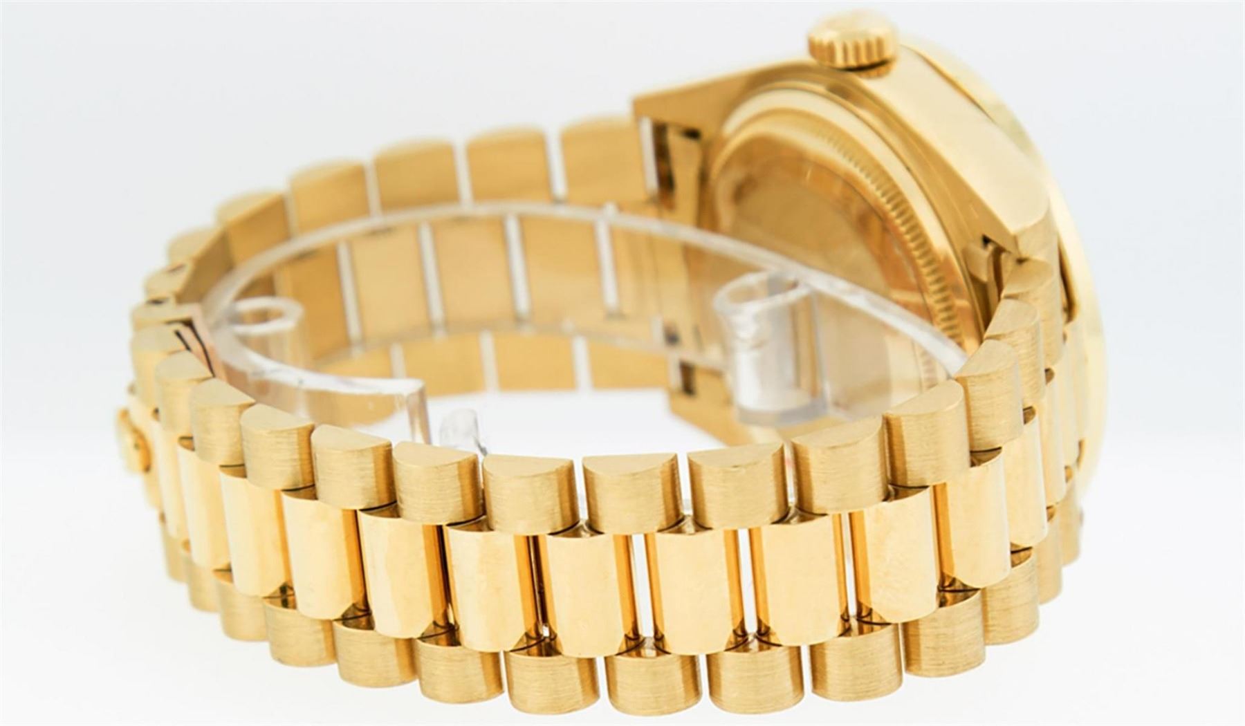 One Mens Rolex Day Date 18K Yellow Gold President Polished, Serviced & Electronically Tested, 18K Yellow Gold Case: 36mm, 18K Yellow Gold Crown, Custom Bezel: New 18K Yellow Gold Channel Set + Ruby Diamond Bezel, Diamond + Stone Count: 52 Diamonds + 4 Rubies On Bezel. Total Weight 1.30 Carat, Clarity: SI-VS, Color: G to H. Custom Crystal: New Scratch Resistant Synthetic Sapphire Cyclops Lens. Custom Hands: New Luminescent Hands. This Watch Has Been Serviced Time Tested And Is In Excellent Condition It Is Free Of All Scratches And Dents. Movement: Automatic Winding Movement Caliber 3055. Dial: Champagne Index With Roman Track & Lumi Dots. Date Window: 3 O'Clock Position Date Display, Day Window: 12 O'Clock Position Date Display. Quickset, Model: Day Date President. Condition: G-6 Extra Fine The Watch Is In Very Good Condition Free Of All Scratches And Dents. Bracelet: 18K Yellow Gold President Band. Bright Polish. 7.0 Inch Length, Standard Hidden President Clasp President Band, With Rolex Logo. This Watch Comes With A Rolex Box & Appraisal.