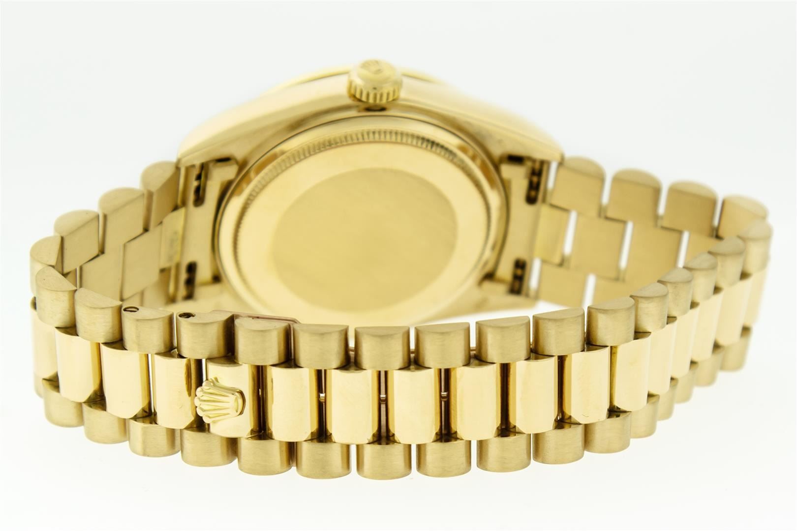 One Mens Pre Owned Rolex Day Date 18K Yellow Gold President Polished, Serviced & Electronically Tested, Rolex 18K Yellow Gold Case: 36mm, Rolex 18K Yellow Gold Crown, Custom Bezel: New 18K Yellow Gold Beadset Diamond Bezel, Diamond Count 44 Diamonds On Bezel. Total Weight 1.0 Carat, Clarity: SI-VS, Color: G to H. Custom Crystal: New Sapphire With Magnified Date Window. Custom Hands: New Luminescent Hands. Rolex Movement: Automatic Winding Movement Caliber 3055. Rolex Dial: Factory Champagne Diamond Dial, Diamond Count: 8 Diamonds + 2 Baguettes, Clarity: VS. Date Window: 3 O'Clock Position Date Display, Day Window: 12 O'Clock Position Date Display. Quickset, Model: Day Date President. Condition: G-6 Extra Fine. Rolex Bracelet: New 18K Yellow Gold President Band. Bright Polish. 7.0 Inch Length, Standard Hidden President Clasp President Band, With Rolex Logo. This Watch Has Been Serviced And Polished It Is Free Of All Scratches And Dents.