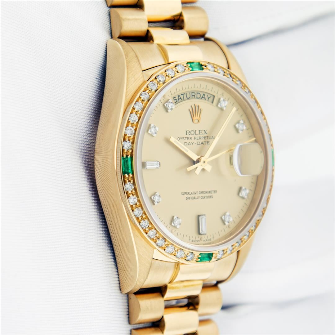 One Mens Pre Owned Rolex Day Date 18K Yellow Gold President Polished, Serviced & Electronically Tested, Rolex 18K Yellow Gold Case: 36mm, Rolex 18K Yellow Gold Crown, Custom Bezel: Custom Bezel: New 18K Yellow Gold Diamond Bezel, Diamond Count 36 Diamonds + 4 Emeralds On Bezel, Clarity: SI-VS, Color: G to H.. Custom Crystal: New Sapphire With Magnified Date Window. Custom Hands: New Luminescent Hands. Rolex Movement: Automatic Winding Movement Caliber 3055. Rolex Dial: Factory Champagne Diamond Dial, Diamond Count: 8 Diamonds + 2 Baguettes, Clarity: VS. Date Window: 3 O'Clock Position Date Display, Day Window: 12 O'Clock Position Date Display. Quickset, Model: Day Date President. Condition: G-6 Extra Fine. Rolex Bracelet: New 18K Yellow Gold President Band. Bright Polish. 7.0 Inch Length, Standard Hidden President Clasp President Band, With Rolex Logo. This Watch Has Been Serviced And Polished It Is Free Of All Scratches And Dents.
