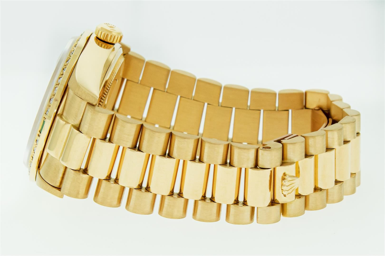 One Mens Pre Owned Quickset Rolex Day Date 18K Yellow Gold President Polished, Serviced & Electronically Tested, Rolex 18K Yellow Gold Case: 36mm, Rolex 18K Yellow Gold Crown, Custom Bezel: New 18K Yellow Gold Beadset Diamond & Emerald Bezel, Diamond Count: 36 Diamonds + 4 Emeralds On Bezel. Custom Crystal: New Sapphire With Magnified Date Window. Rolex Movement: Automatic Quickset Winding Movement Caliber 3055. Rolex Dial: Champagne Index With Roman Track & Lumi Dots. Custom Hands: New Hands. Date Window: 3 O'Clock Position, Day Display: 12 O'Clock Position, Single Quickset, Model: Day Date President. Condition: G-6 Extra Fine. Rolex Bracelet: 18K Yellow Gold President Band With Hidden Clasp, Bright & Satin Polish. 7.0 Inch Length, Standard President Clasp, With Rolex Logo. This Watch Has Been Serviced And Polished It Is Free Of All Scratches And Dents.