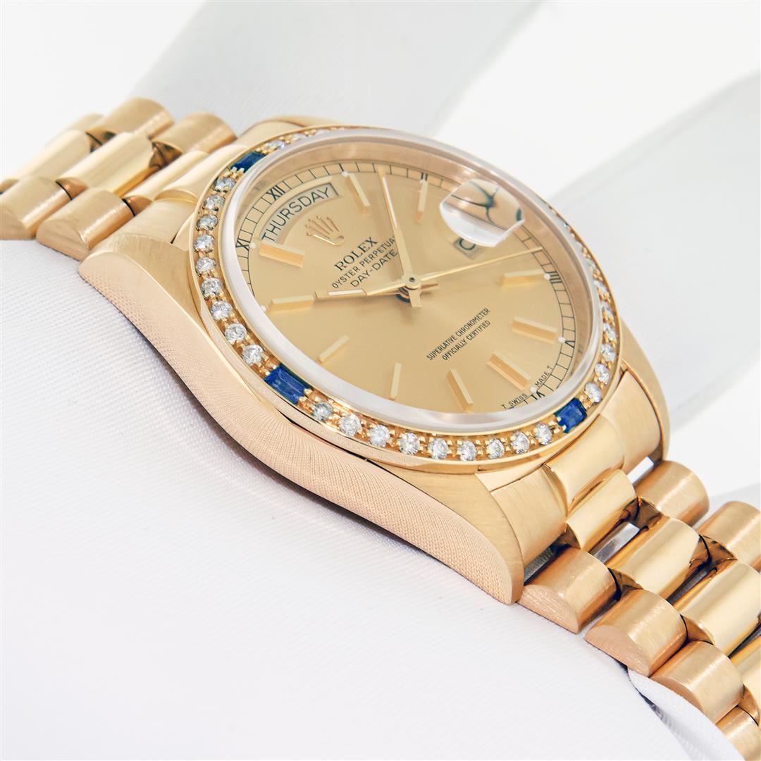 One Mens Pre Owned Quickset Rolex Day Date 18K Yellow Gold President Polished, Serviced & Electronically Tested, Rolex 18K Yellow Gold Case: 36mm, Rolex 18K Yellow Gold Crown, Custom Bezel: New 18K Yellow Gold Beadset Diamond & Sapphire Bezel, Diamond Count: 36 Diamonds + 4 Sapphires On Bezel. Custom Crystal: New Sapphire With Magnified Date Window. Rolex Movement: Automatic Quickset Winding Movement Caliber 3055. Rolex Dial: Champagne Index With Roman Track & Lumi Dots. Custom Hands: New Hands. Date Window: 3 O'Clock Position, Day Display: 12 O'Clock Position, Single Quickset, Model: Day Date President. Condition: G-6 Extra Fine. Rolex Bracelet: 18K Yellow Gold President Band With Hidden Clasp, Bright & Satin Polish. 7.0 Inch Length, Standard President Clasp, With Rolex Logo. This Watch Has Been Serviced And Polished It Is Free Of All Scratches And Dents.