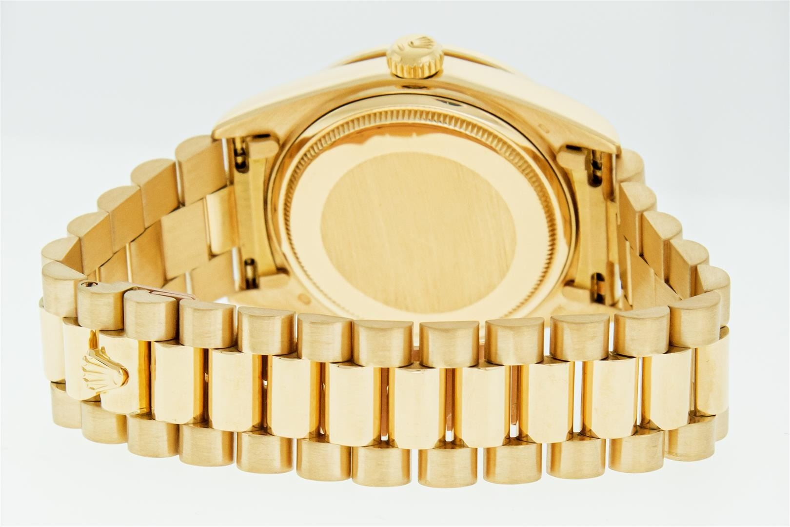 One Mens Pre Owned Quickset Rolex Day Date 18K Yellow Gold President Polished, Serviced & Electronically Tested, Rolex 18K Yellow Gold Case: 36mm, Rolex 18K Yellow Gold Crown, Custom Bezel: New 18K Yellow Gold Beadset Diamond & Sapphire Bezel, Diamond Count: 36 Diamonds + 4 Sapphires On Bezel. Custom Crystal: New Sapphire With Magnified Date Window. Rolex Movement: Automatic Quickset Winding Movement Caliber 3055. Rolex Dial: Champagne Index With Roman Track & Lumi Dots. Custom Hands: New Hands. Date Window: 3 O'Clock Position, Day Display: 12 O'Clock Position, Single Quickset, Model: Day Date President. Condition: G-6 Extra Fine. Rolex Bracelet: 18K Yellow Gold President Band With Hidden Clasp, Bright & Satin Polish. 7.0 Inch Length, Standard President Clasp, With Rolex Logo. This Watch Has Been Serviced And Polished It Is Free Of All Scratches And Dents.