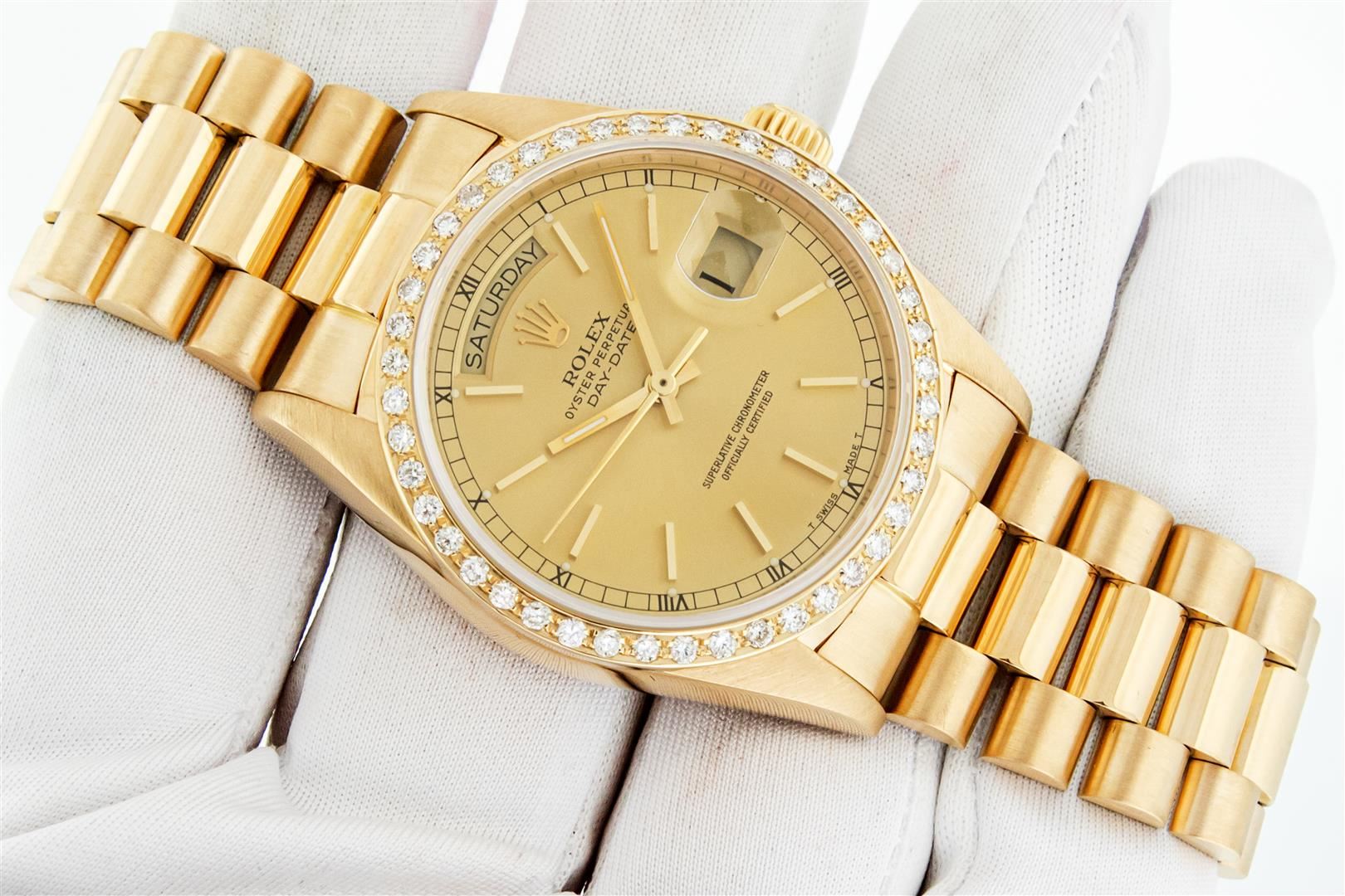 One Mens Pre Owned Quickset Rolex Day Date 18K Yellow Gold President Polished, Serviced & Electronically Tested, Rolex 18K Yellow Gold Case: 36mm, Rolex 18K Yellow Gold Crown, Custom Bezel: New 18K Yellow Gold Beadset Diamond Bezel, Diamond Count: 44 Diamonds On Bezel. Custom Crystal: New Sapphire With Magnified Date Window. Rolex Movement: Automatic Quickset Winding Movement Caliber 3055. Rolex Dial: Champagne Index With Roman Track & Lumi Dots. Custom Hands: New Hands. Date Window: 3 O'Clock Position, Day Display: 12 O'Clock Position, Single Quickset, Model: Day Date President. Condition: G-6 Extra Fine. Rolex Bracelet: 18K Yellow Gold President Band With Hidden Clasp, Bright & Satin Polish. 7.0 Inch Length, Standard President Clasp, With Rolex Logo. This Watch Has Been Serviced And Polished It Is Free Of All Scratches And Dents.