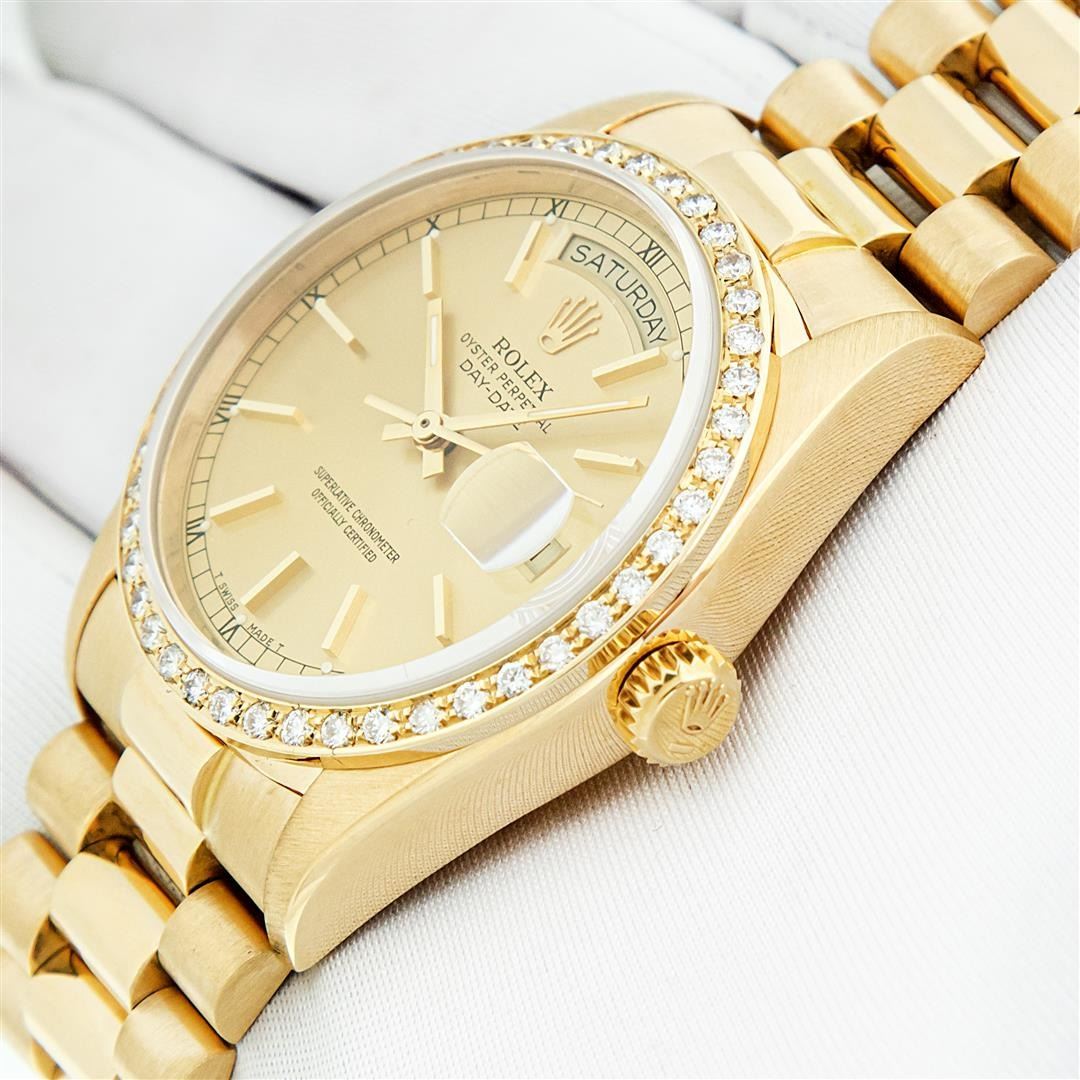 One Mens Pre Owned Quickset Rolex Day Date 18K Yellow Gold President Polished, Serviced & Electronically Tested, Rolex 18K Yellow Gold Case: 36mm, Rolex 18K Yellow Gold Crown, Custom Bezel: New 18K Yellow Gold Beadset Diamond Bezel, Diamond Count: 44 Diamonds On Bezel. Custom Crystal: New Sapphire With Magnified Date Window. Rolex Movement: Automatic Quickset Winding Movement Caliber 3055. Rolex Dial: Champagne Index With Roman Track & Lumi Dots. Custom Hands: New Hands. Date Window: 3 O'Clock Position, Day Display: 12 O'Clock Position, Single Quickset, Model: Day Date President. Condition: G-6 Extra Fine. Rolex Bracelet: 18K Yellow Gold President Band With Hidden Clasp, Bright & Satin Polish. 7.0 Inch Length, Standard President Clasp, With Rolex Logo. This Watch Has Been Serviced And Polished It Is Free Of All Scratches And Dents.