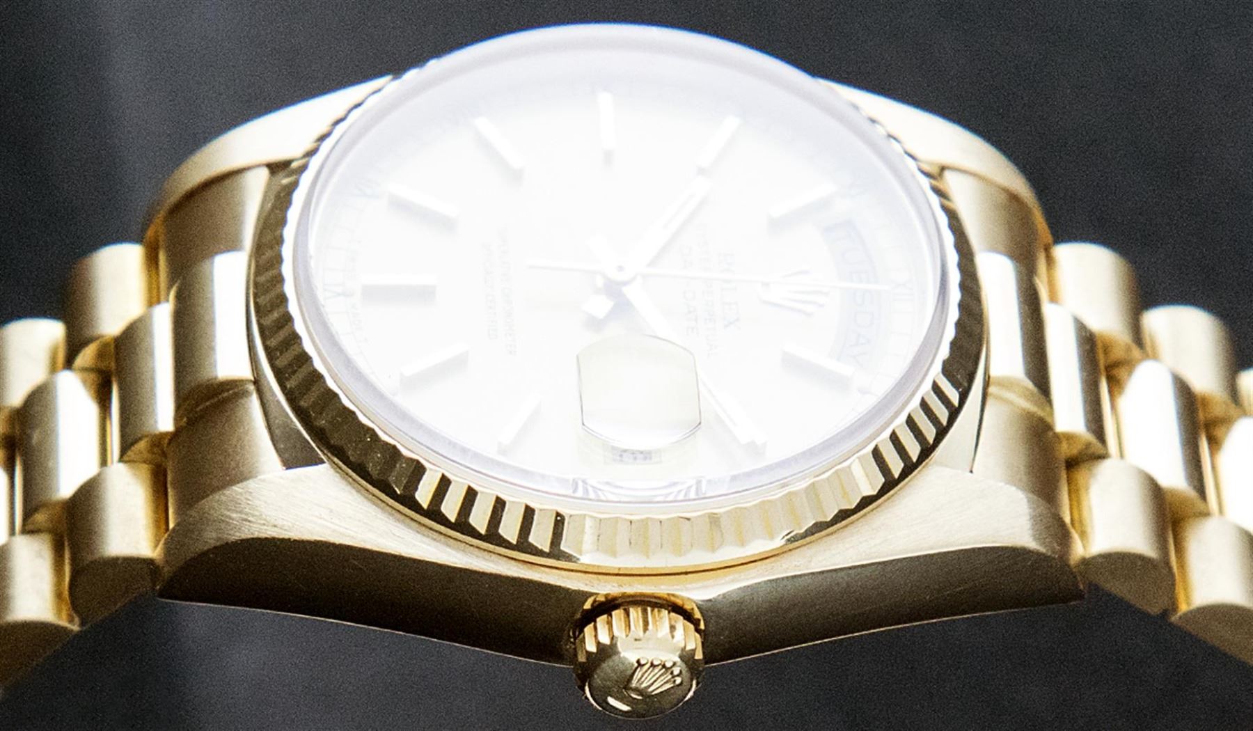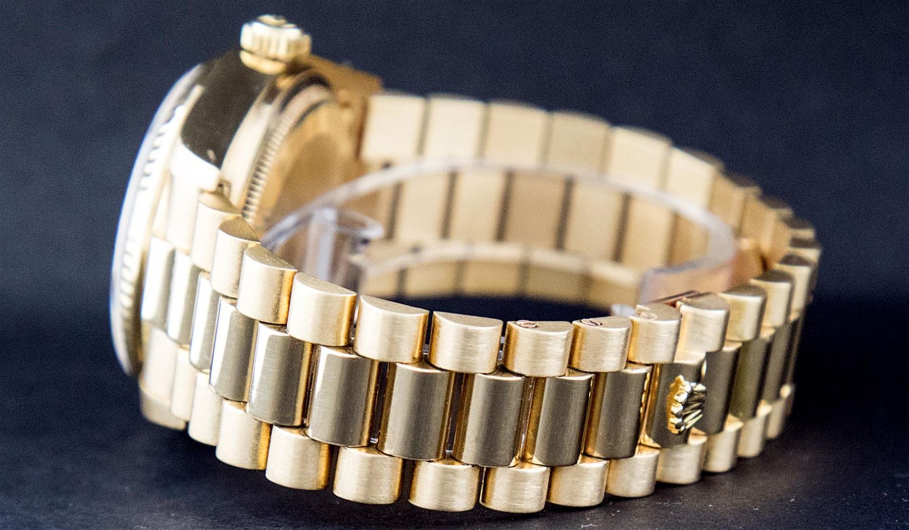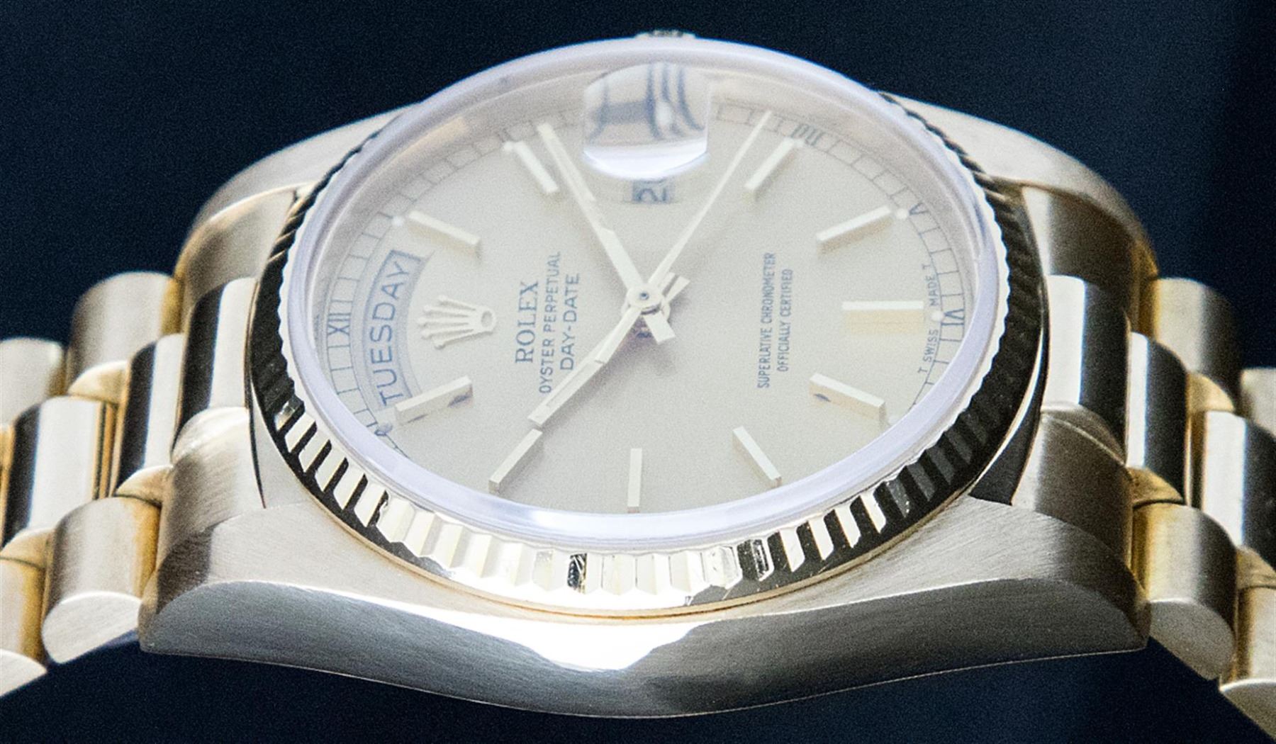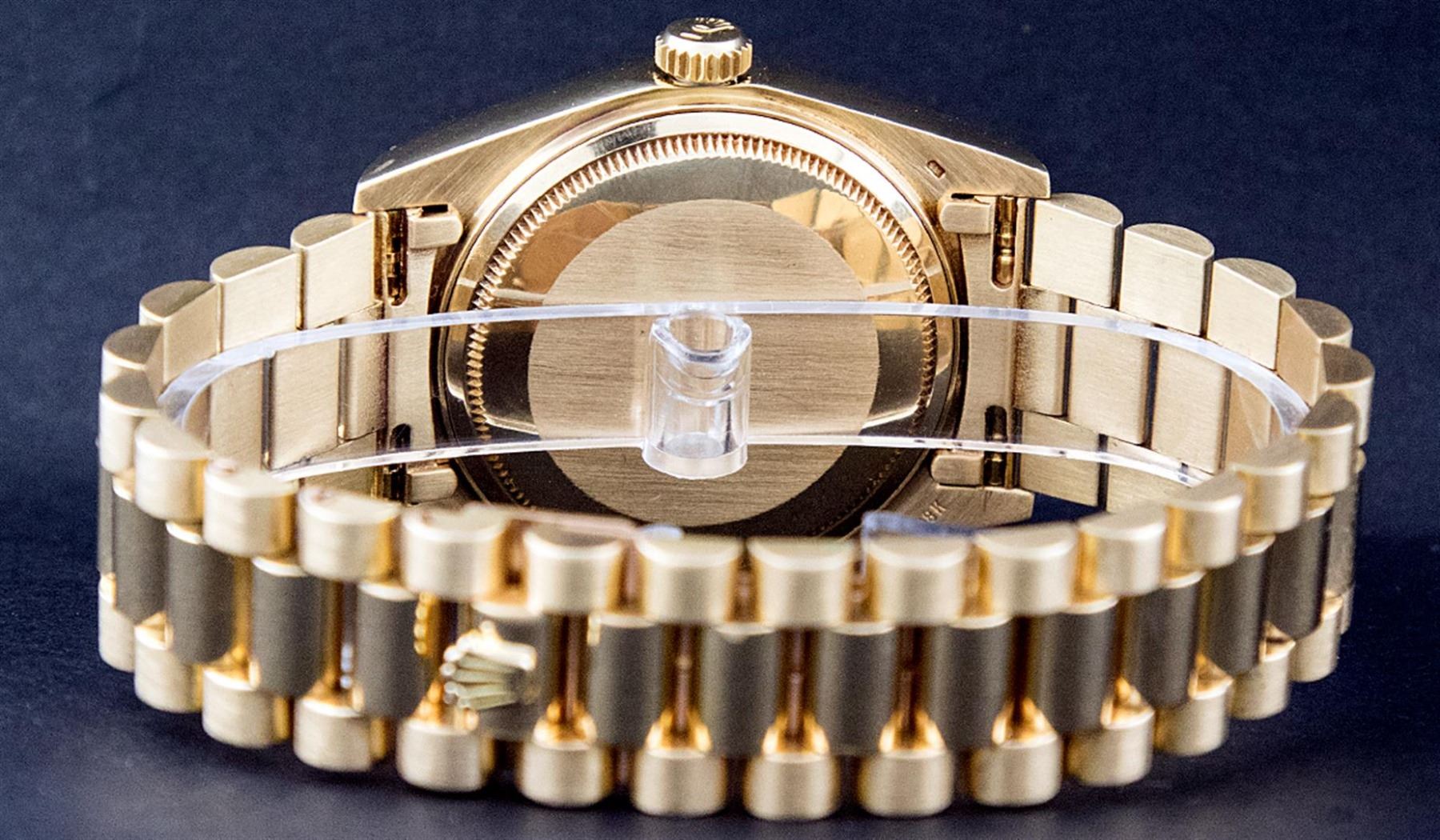 One Mens Double Quickset Rolex Day Date 18K Yellow Gold President Polished, Serviced & Electronically Tested, Rolex 18K Yellow Gold Case: 36mm, Rolex 18K Yellow Gold Crown, Rolex Bezel: 18K Yellow Gold Fluted Bezel. Crystal: Sapphire With Magnified Date Window. Hands: Luminescent Hands. Rolex Movement: Automatic Quickset Winding Movement Caliber 3155. Rolex Dial: Champagne Index With Roman Track & Lumi Dots. Date Window: 3 O'Clock Position, Day Display: 12 O'Clock Position, Double Quickset, Model: Day Date Double Quickset President. Condition: G-6 Extra Fine. Rolex Bracelet: 18K Yellow Gold President Band With Hidden Clasp, Bright & Satin Polish. 7.0 Inch Length, Hidden President Clasp, With Rolex Logo. This Pre Owned Watch Has Been Serviced Time Tested And Is In Excellent Condition It Is Free Of All Scratches And Dents.