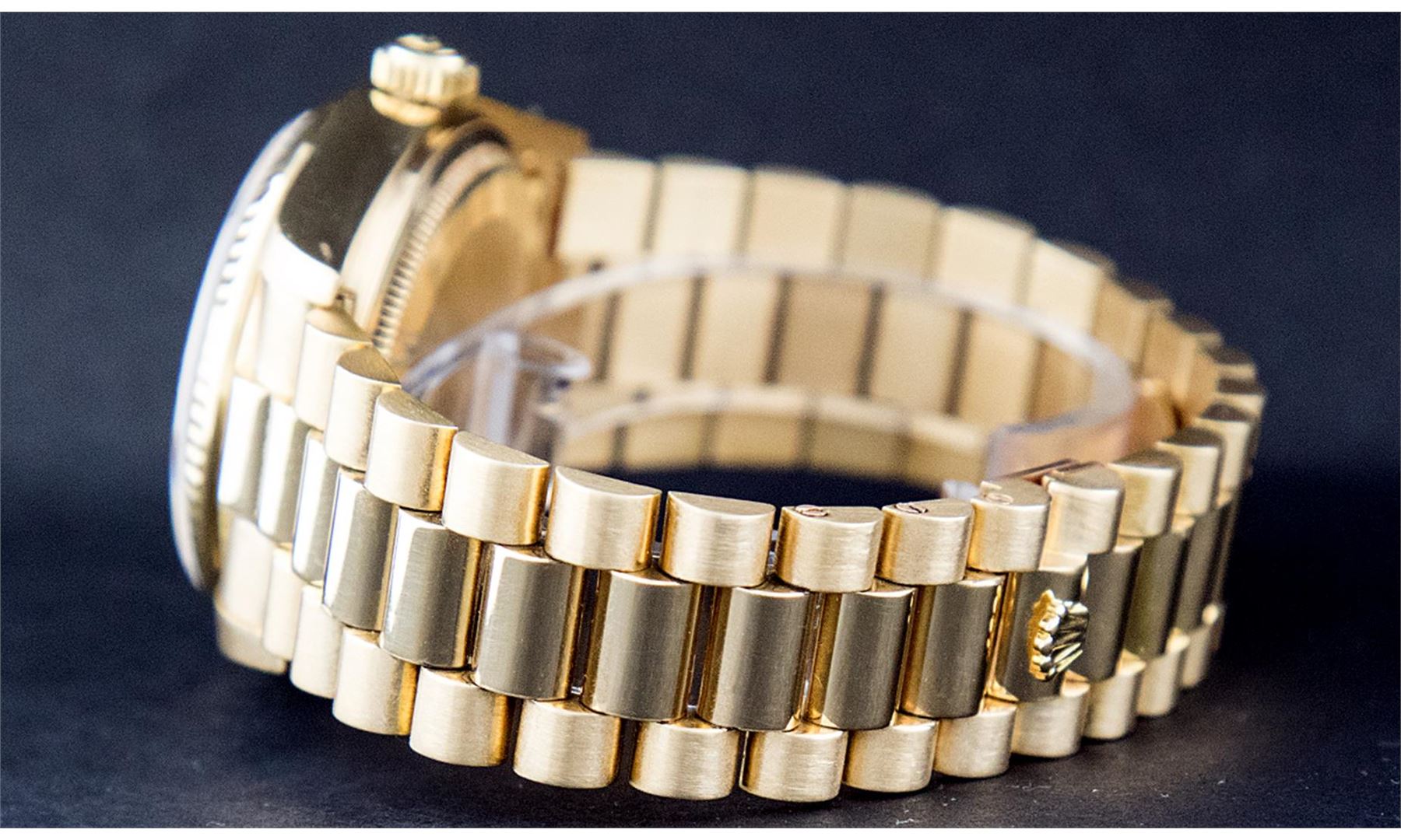 One Mens Double Quickset Rolex Day Date 18K Yellow Gold President Polished, Serviced & Electronically Tested, Rolex 18K Yellow Gold Case: 36mm, Rolex 18K Yellow Gold Crown, Rolex Bezel: 18K Yellow Gold Fluted Bezel. Crystal: Sapphire With Magnified Date Window. Hands: Luminescent Hands. Rolex Movement: Automatic Quickset Winding Movement Caliber 3155. Rolex Dial: Champagne Index With Roman Track & Lumi Dots. Date Window: 3 O'Clock Position, Day Display: 12 O'Clock Position, Double Quickset, Model: Day Date Double Quickset President. Condition: G-6 Extra Fine. Rolex Bracelet: 18K Yellow Gold President Band With Hidden Clasp, Bright & Satin Polish. 7.0 Inch Length, Hidden President Clasp, With Rolex Logo. This Pre Owned Watch Has Been Serviced Time Tested And Is In Excellent Condition It Is Free Of All Scratches And Dents.