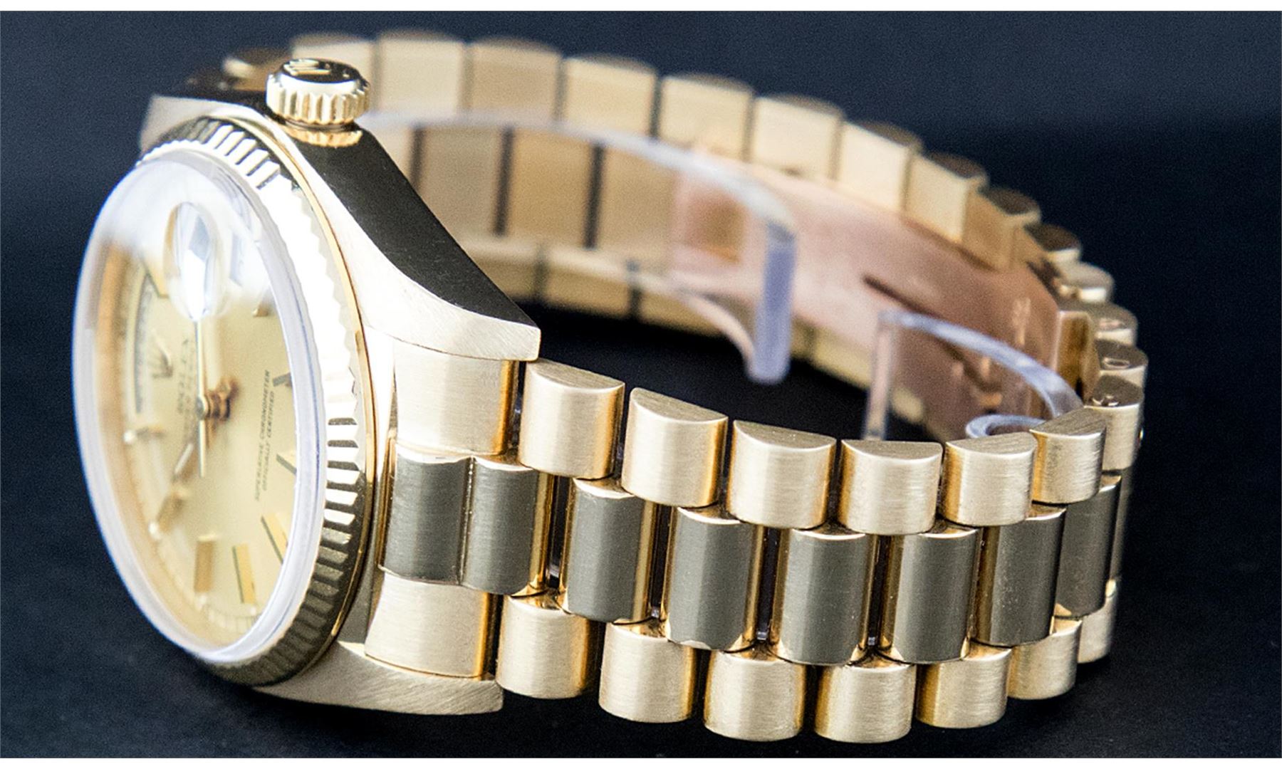 One Mens Double Quickset Rolex Day Date 18K Yellow Gold President Polished, Serviced & Electronically Tested, Rolex 18K Yellow Gold Case: 36mm, Rolex 18K Yellow Gold Crown, Rolex Bezel: 18K Yellow Gold Fluted Bezel. Crystal: Sapphire With Magnified Date Window. Hands: Luminescent Hands. Rolex Movement: Automatic Quickset Winding Movement Caliber 3155. Rolex Dial: Champagne Index With Roman Track & Lumi Dots. Date Window: 3 O'Clock Position, Day Display: 12 O'Clock Position, Double Quickset, Model: Day Date Double Quickset President. Condition: G-6 Extra Fine. Rolex Bracelet: 18K Yellow Gold President Band With Hidden Clasp, Bright & Satin Polish. 7.0 Inch Length, Hidden President Clasp, With Rolex Logo. This Pre Owned Watch Has Been Serviced Time Tested And Is In Excellent Condition It Is Free Of All Scratches And Dents.