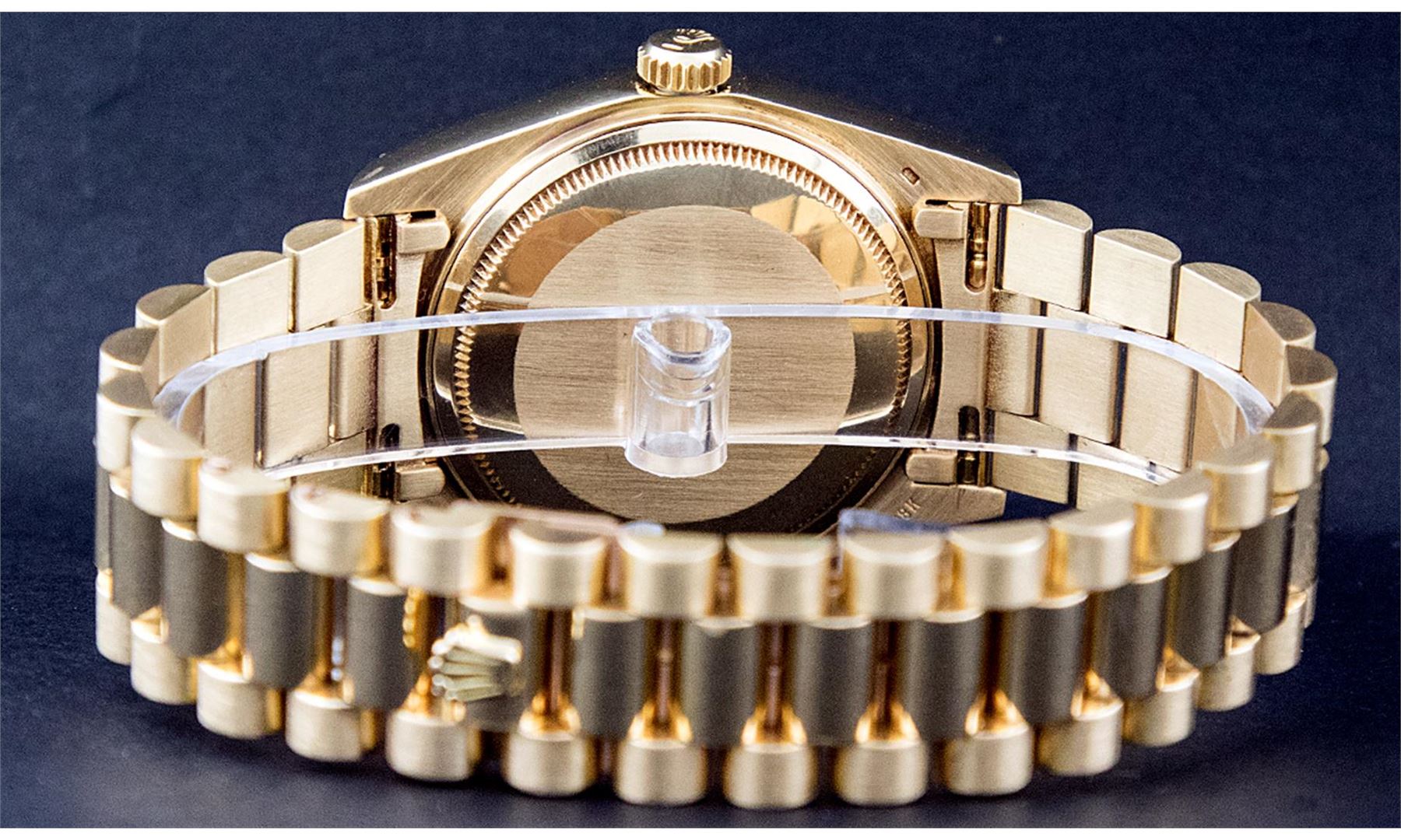 One Mens Double Quickset Rolex Day Date 18K Yellow Gold President Polished, Serviced & Electronically Tested, Rolex 18K Yellow Gold Case: 36mm, Rolex 18K Yellow Gold Crown, Rolex Bezel: 18K Yellow Gold Fluted Bezel. Crystal: Sapphire With Magnified Date Window. Hands: Luminescent Hands. Rolex Movement: Automatic Quickset Winding Movement Caliber 3155. Rolex Dial: Champagne Index With Roman Track & Lumi Dots. Date Window: 3 O'Clock Position, Day Display: 12 O'Clock Position, Double Quickset, Model: Day Date Double Quickset President. Condition: G-6 Extra Fine. Rolex Bracelet: 18K Yellow Gold President Band With Hidden Clasp, Bright & Satin Polish. 7.0 Inch Length, Hidden President Clasp, With Rolex Logo. This Pre Owned Watch Has Been Serviced Time Tested And Is In Excellent Condition It Is Free Of All Scratches And Dents.