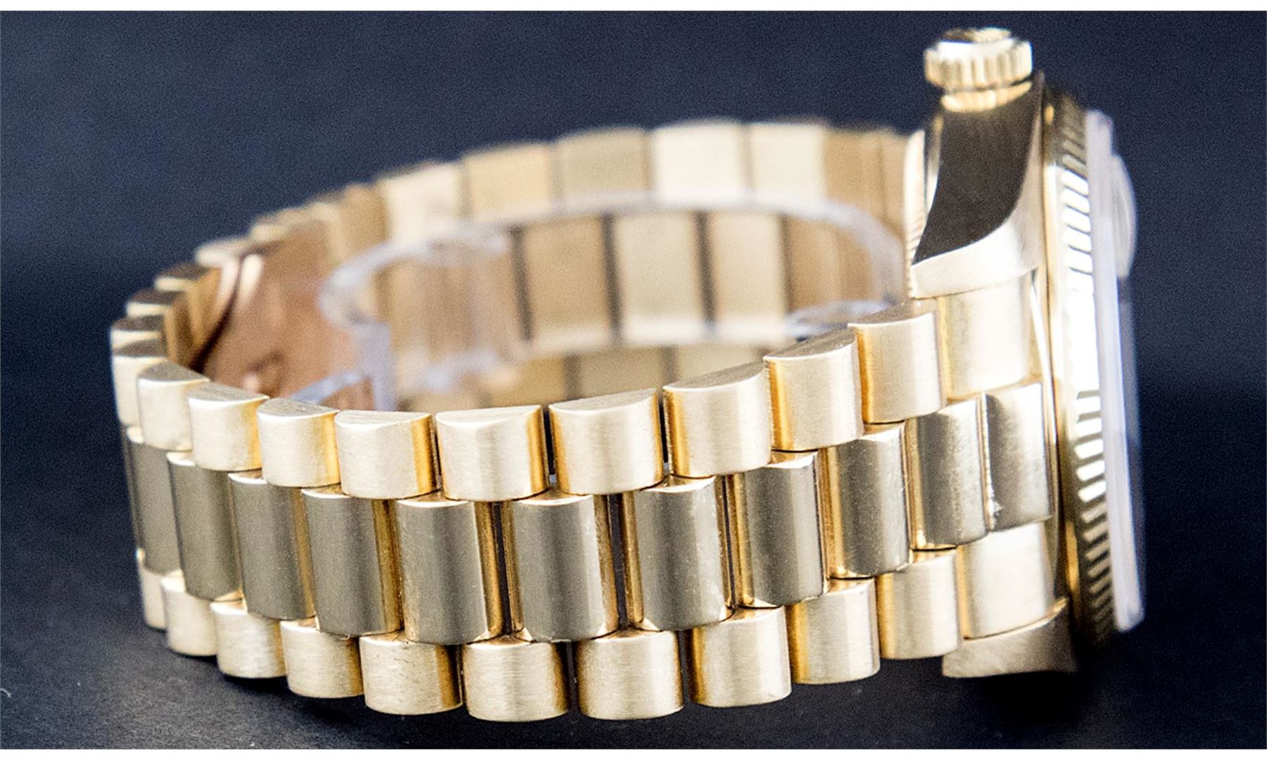 One Mens Double Quickset Rolex Day Date 18K Yellow Gold President Polished, Serviced & Electronically Tested, Rolex 18K Yellow Gold Case: 36mm, Rolex 18K Yellow Gold Crown, Rolex Bezel: 18K Yellow Gold Fluted Bezel. Crystal: Sapphire With Magnified Date Window. Hands: Luminescent Hands. Rolex Movement: Automatic Quickset Winding Movement Caliber 3155. Rolex Dial: Champagne Index With Roman Track & Lumi Dots. Date Window: 3 O'Clock Position, Day Display: 12 O'Clock Position, Double Quickset, Model: Day Date Double Quickset President. Condition: G-6 Extra Fine. Rolex Bracelet: 18K Yellow Gold President Band With Hidden Clasp, Bright & Satin Polish. 7.0 Inch Length, Hidden President Clasp, With Rolex Logo. This Pre Owned Watch Has Been Serviced Time Tested And Is In Excellent Condition It Is Free Of All Scratches And Dents.