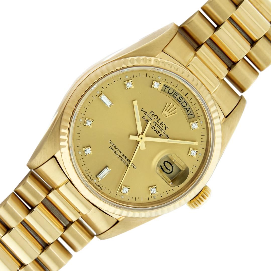 One Mens Pre Owned Quickset Rolex Day Date 18K Yellow Gold President Polished, Serviced & Electronically Tested, Rolex 18K Yellow Gold Case: 36mm, Rolex 18K Yellow Gold Crown, Rolex Bezel: 18K Yellow Gold Fluted Bezel. Crystal: Sapphire With Magnified Date Window. Rolex Movement: Automatic Quickset Winding Movement Caliber 3055. Rolex Dial: Factory Champagne Diamond Dial, Stone Count: 8 Diamonds + 2 Baguette Diamonds, Clarity: VS. Date Window: 3 O'Clock Position, Day Display: 12 O'Clock Position, Single Quickset, Model: Day Date President 3055. Condition: G-6 Extra Fine. Rolex Bracelet: 18K Yellow Gold President Band With Hidden Clasp, Bright & Satin Polish. 7.0 Inch Length, Standard President Clasp, With Rolex Logo. This Watch Has Been Serviced And Polished It Is Free Of All Scratches And Dents.