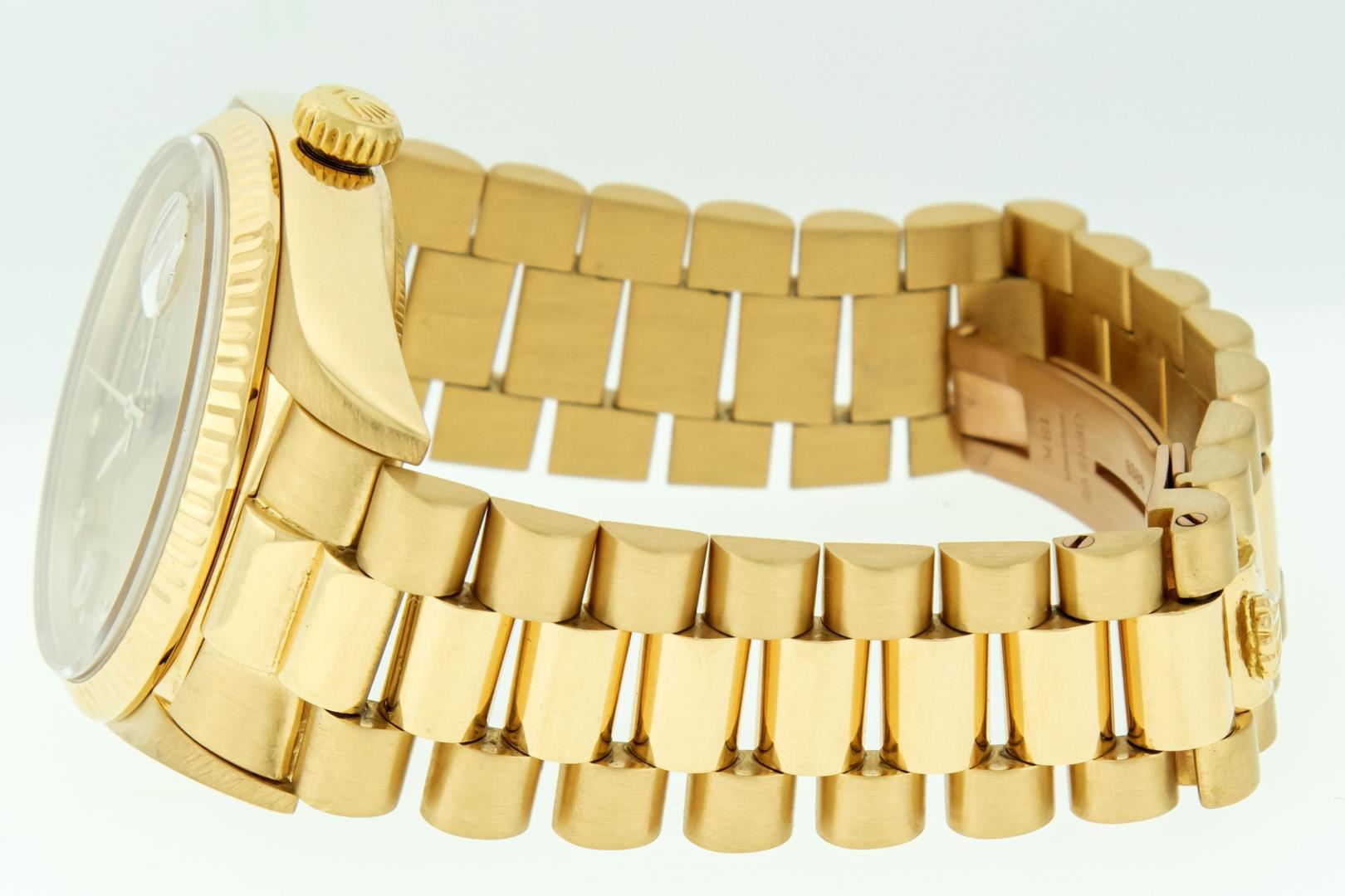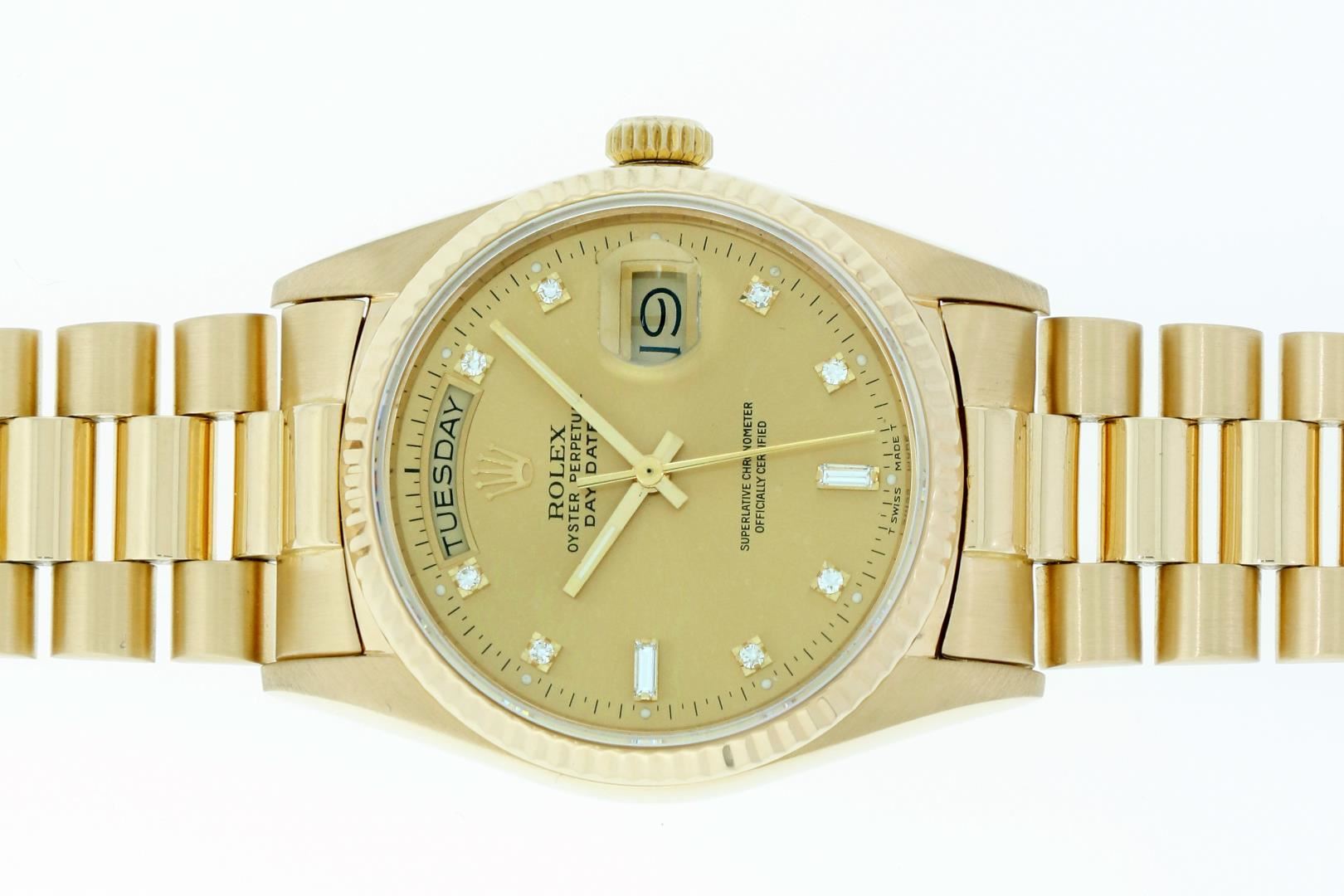 One Mens Pre Owned Quickset Rolex Day Date 18K Yellow Gold President Polished, Serviced & Electronically Tested, Rolex 18K Yellow Gold Case: 36mm, Rolex 18K Yellow Gold Crown, Rolex Bezel: 18K Yellow Gold Fluted Bezel. Crystal: Sapphire With Magnified Date Window. Rolex Movement: Automatic Quickset Winding Movement Caliber 3055. Rolex Dial: Factory Champagne Diamond Dial, Stone Count: 8 Diamonds + 2 Baguette Diamonds, Clarity: VS. Date Window: 3 O'Clock Position, Day Display: 12 O'Clock Position, Single Quickset, Model: Day Date President 3055. Condition: G-6 Extra Fine. Rolex Bracelet: 18K Yellow Gold President Band With Hidden Clasp, Bright & Satin Polish. 7.0 Inch Length, Standard President Clasp, With Rolex Logo. This Watch Has Been Serviced And Polished It Is Free Of All Scratches And Dents.