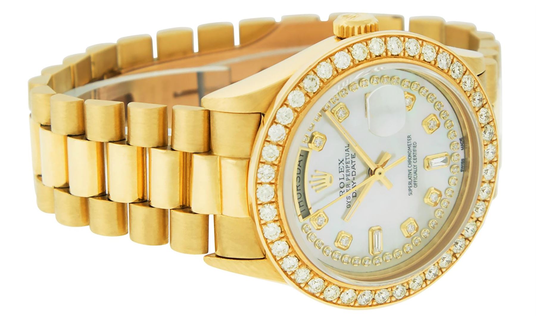 One Mens Rolex Day Date 18K Yellow Gold President Polished, Serviced & Electronically Tested, 18K Yellow Gold Case: 36mm, 18K Yellow Gold Crown, Custom Bezel: 18K Yellow Gold 2.5ctw Beadset Diamond Bezel, Diamond Count: 42 Diamonds On Bezel. Total Weight 2.5 Carat, Clarity: SI-VS, Color: G to H. Custom Crystal: New Synthetic Sapphire Cyclops Lens. Custom Hands: New Luminescent Hands. Movement: Automatic Winding Movement Caliber 3055. Custom Dial: Refinished Mother Of Pearl String Diamond Dial, Diamond Count: 49 Diamonds + 2 Baguettes, Color: G to H, Clarity: SI-VS. Date Window: 3 O'Clock Position Date Display, Day Window: 12 O'Clock Position Date Display. Quickset, Model: Day Date President. Condition: G-6 Extra Fine The Watch Is In Very Good Condition Free Of All Scratches And Dents. Bracelet: 18K Yellow Gold President Band. Bright Polish. 7.0 Inch Length, Standard Hidden President Clasp President Band, With Rolex Logo. This Watch Comes With A Rolex Box, Appraisal And Watch Winder.