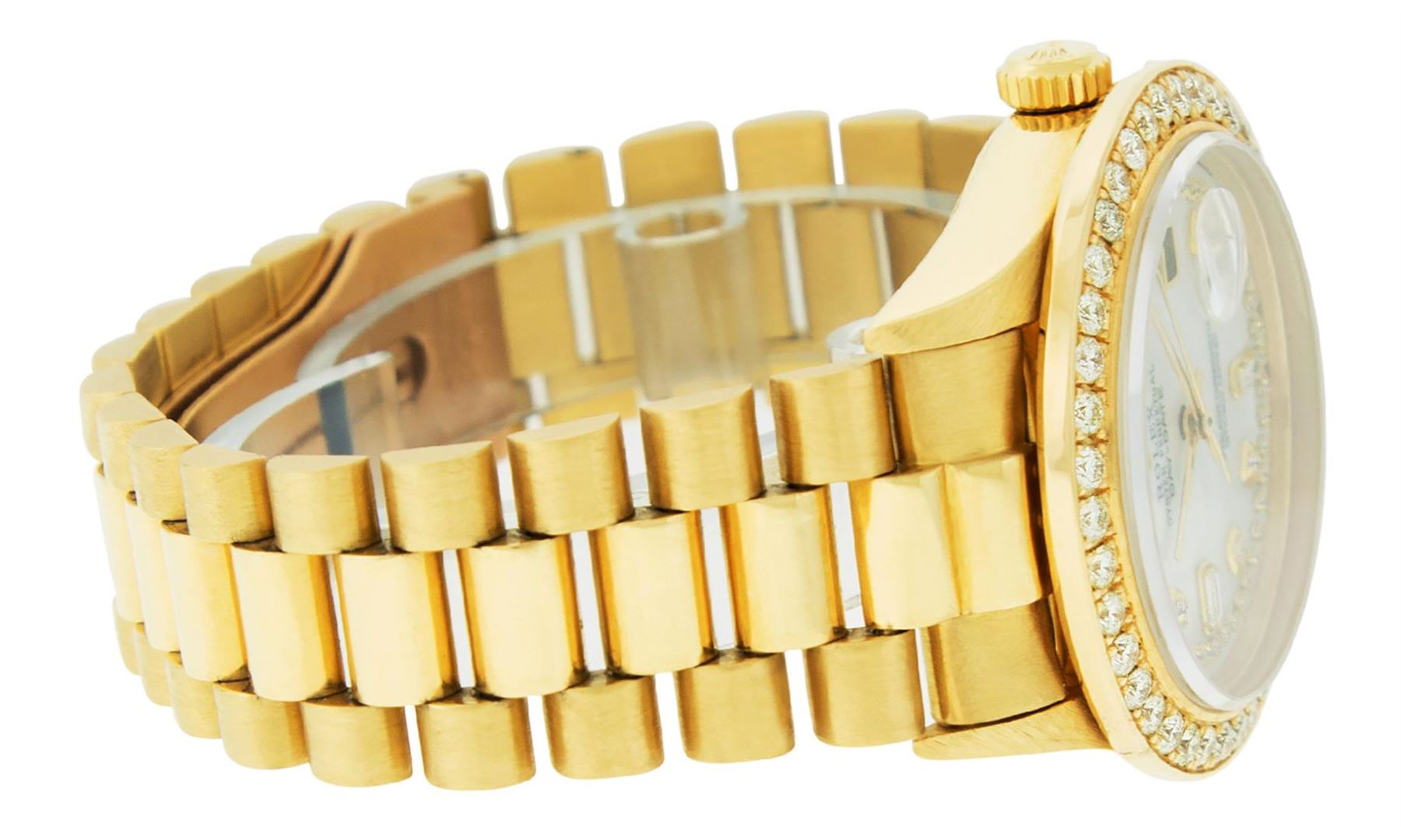 One Mens Rolex Day Date 18K Yellow Gold President Polished, Serviced & Electronically Tested, 18K Yellow Gold Case: 36mm, 18K Yellow Gold Crown, Custom Bezel: 18K Yellow Gold 2.5ctw Beadset Diamond Bezel, Diamond Count: 42 Diamonds On Bezel. Total Weight 2.5 Carat, Clarity: SI-VS, Color: G to H. Custom Crystal: New Synthetic Sapphire Cyclops Lens. Custom Hands: New Luminescent Hands. Movement: Automatic Winding Movement Caliber 3055. Custom Dial: Refinished Mother Of Pearl String Diamond Dial, Diamond Count: 49 Diamonds + 2 Baguettes, Color: G to H, Clarity: SI-VS. Date Window: 3 O'Clock Position Date Display, Day Window: 12 O'Clock Position Date Display. Quickset, Model: Day Date President. Condition: G-6 Extra Fine The Watch Is In Very Good Condition Free Of All Scratches And Dents. Bracelet: 18K Yellow Gold President Band. Bright Polish. 7.0 Inch Length, Standard Hidden President Clasp President Band, With Rolex Logo. This Watch Comes With A Rolex Box, Appraisal And Watch Winder.