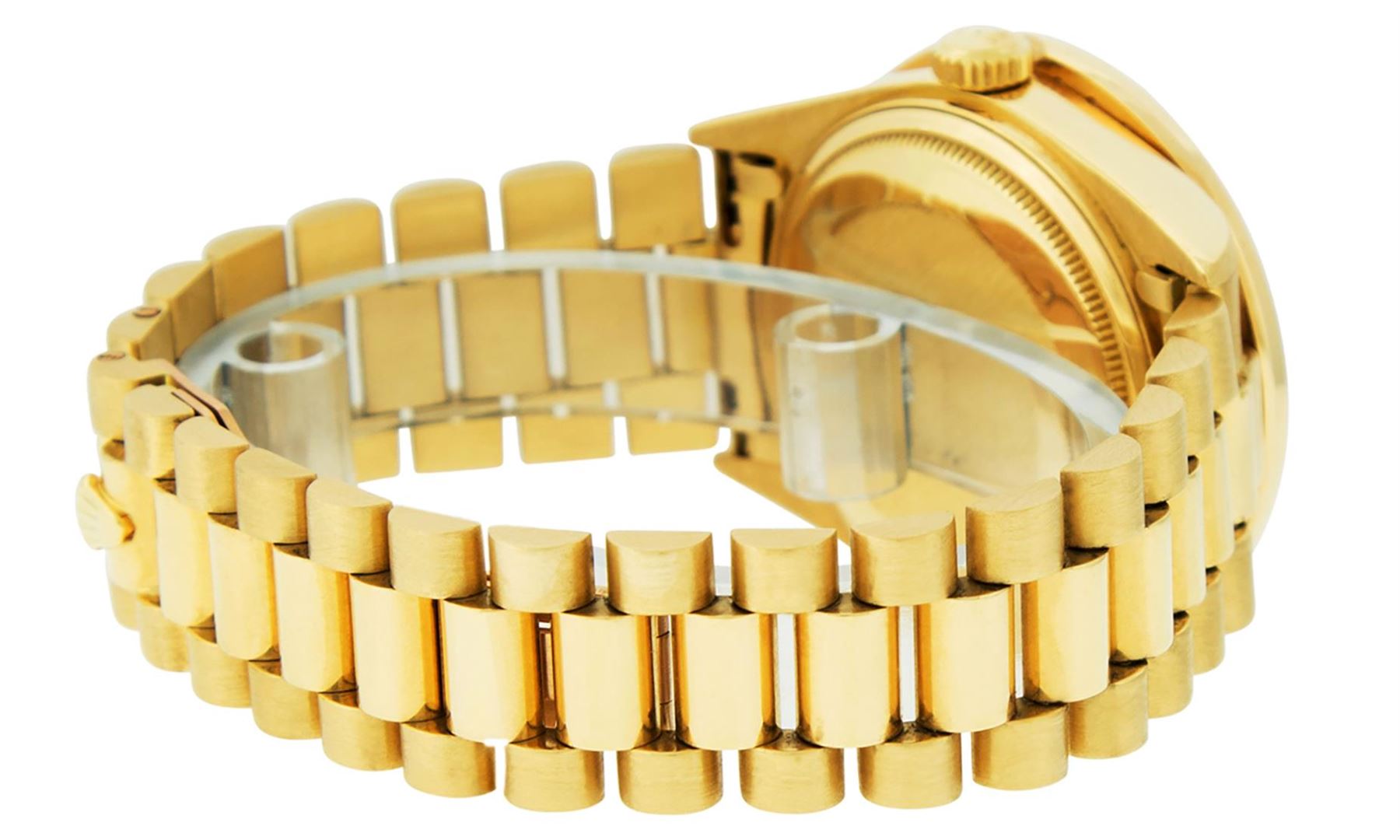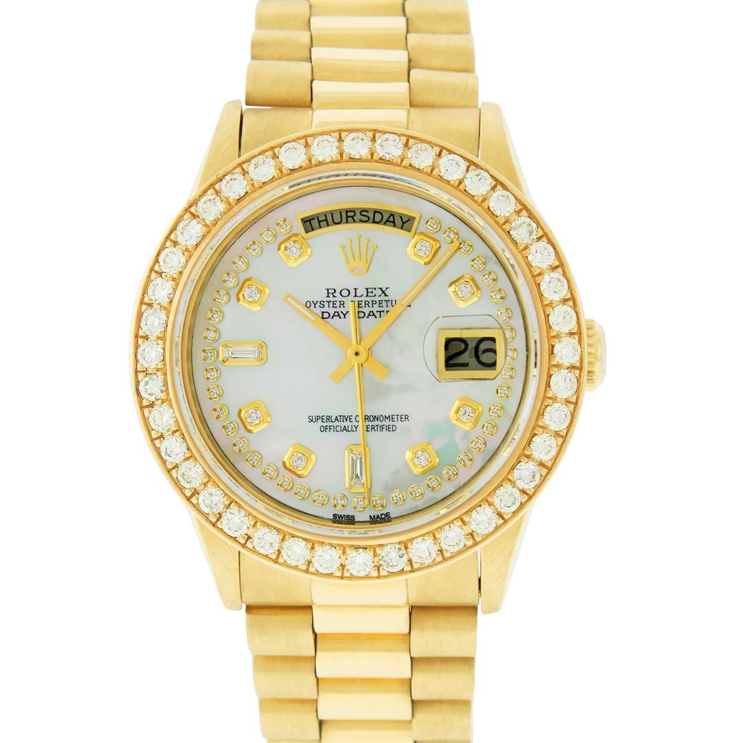 One Mens Rolex Day Date 18K Yellow Gold Presidential Polished, Serviced & Electronically Tested, 18K Yellow Gold Case: 36mm, 18K Yellow Gold Crown, Custom Bezel: 18K Yellow Gold 2.5ctw Beadset Diamond Bezel, Diamond Count: 42 Diamonds On Bezel. Total Diamond Weight 2.5 Carat, Clarity: SI-VS, Color: G to H. Custom Crystal: New Scratch Resistant Synthetic Sapphire Cyclops Lens. Custom Hands: New Luminescent Hands. Movement: Automatic Winding Movement Caliber 3055. Custom Dial: Refinished Mother Of Pearl String Diamond Dial, Diamond Count: 49 Diamonds + 2 Baguettes, Color: G to H, Clarity: SI-VS. Date Window: 3 O'Clock Position Date Display, Day Window: 12 O'Clock Position Date Display. Quickset, Model: Day Date President. Condition: G-6 Extra Fine The Watch Is In Very Good Condition Free Of All Scratches And Dents. Bracelet: 18K Yellow Gold President Band. Bright Polish. 7.0 Inch Length, Standard Hidden President Clasp President Band, With Rolex Logo. This Watch Comes With A Rolex Box & Appraisal.