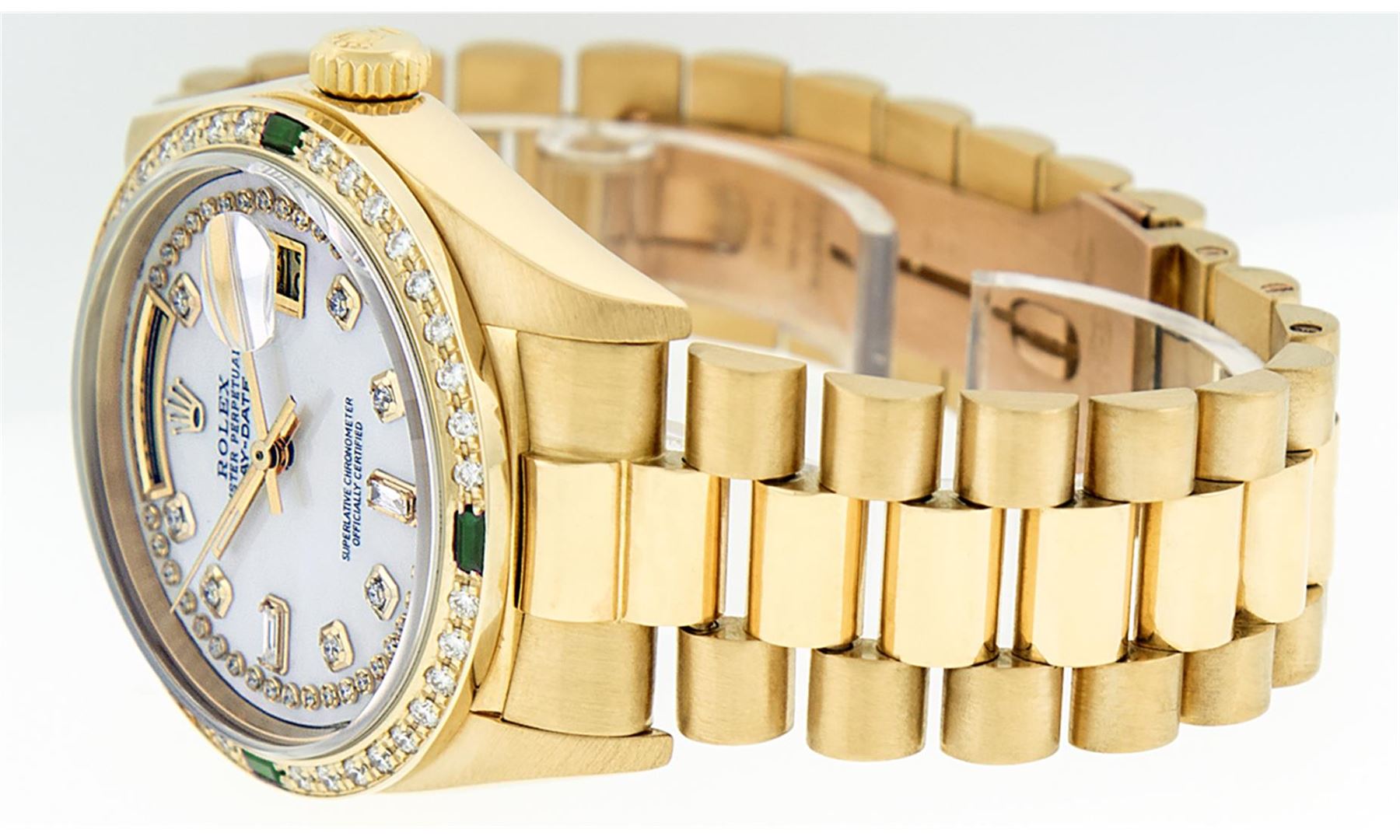 One Mens Rolex Day Date 18K Yellow Gold President Polished, Serviced & Electronically Tested, 18K Yellow Gold Case: 36mm, 18K Yellow Gold Crown, Custom Bezel: New 18K Yellow Gold Beadset + Emerald Diamond Bezel, Diamond + Stone Count: 36 Diamonds + 4 Emeralds On Bezel. Total Weight 1.0 Carat, Clarity: SI-VS, Color: G to H. Custom Crystal: New Scratch Resistant Synthetic Sapphire Cyclops Lens. Custom Hands: New Luminescent Hands. Movement: Automatic Winding Movement Caliber 3055. Custom Dial: Refinished Mother Of Pearl String Diamond Dial, Diamond Count: 49 Diamonds + 2 Baguettes, Color: G to H, Clarity: SI-VS. Date Window: 3 O'Clock Position Date Display, Day Window: 12 O'Clock Position Date Display. Quickset, Model: Day Date President. Condition: G-6 Extra Fine The Watch Is In Very Good Condition Free Of All Scratches And Dents. Bracelet: 18K Yellow Gold President Band. Bright Polish. 6.75 Inch Length, Standard Hidden President Clasp President Band, With Rolex Logo.