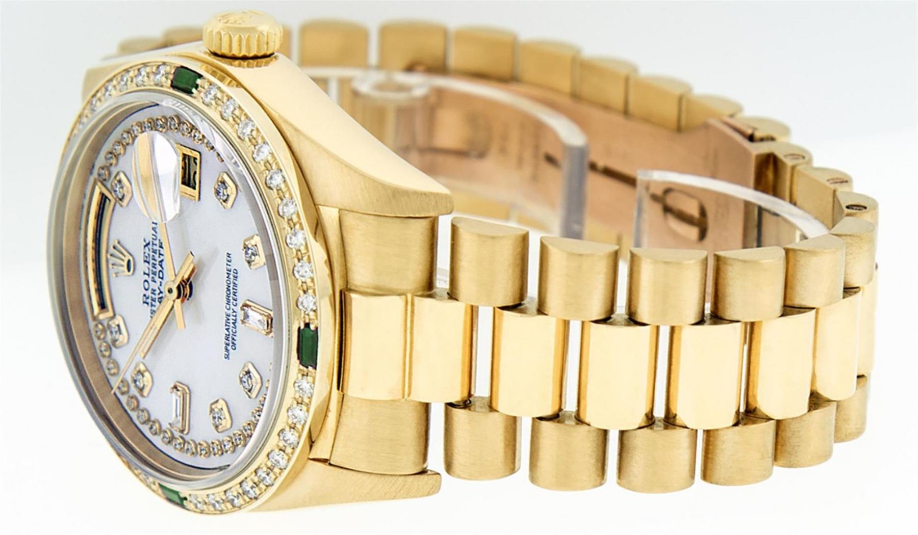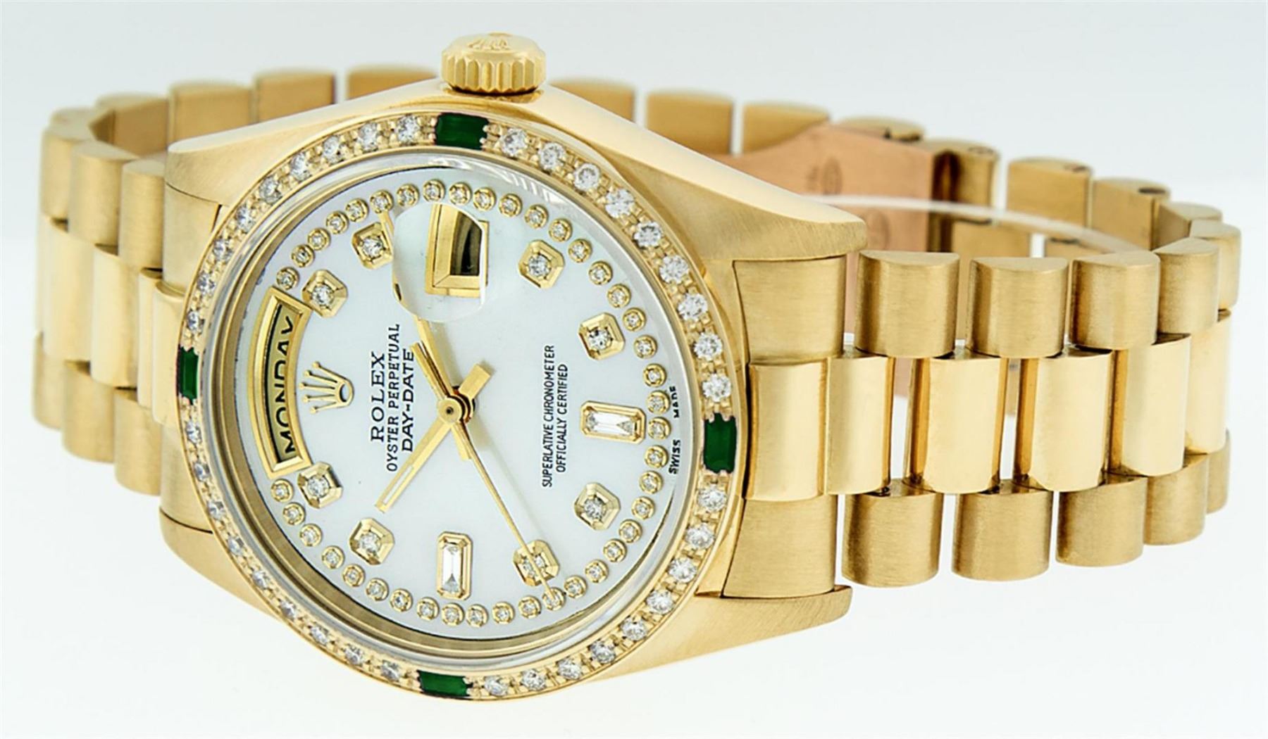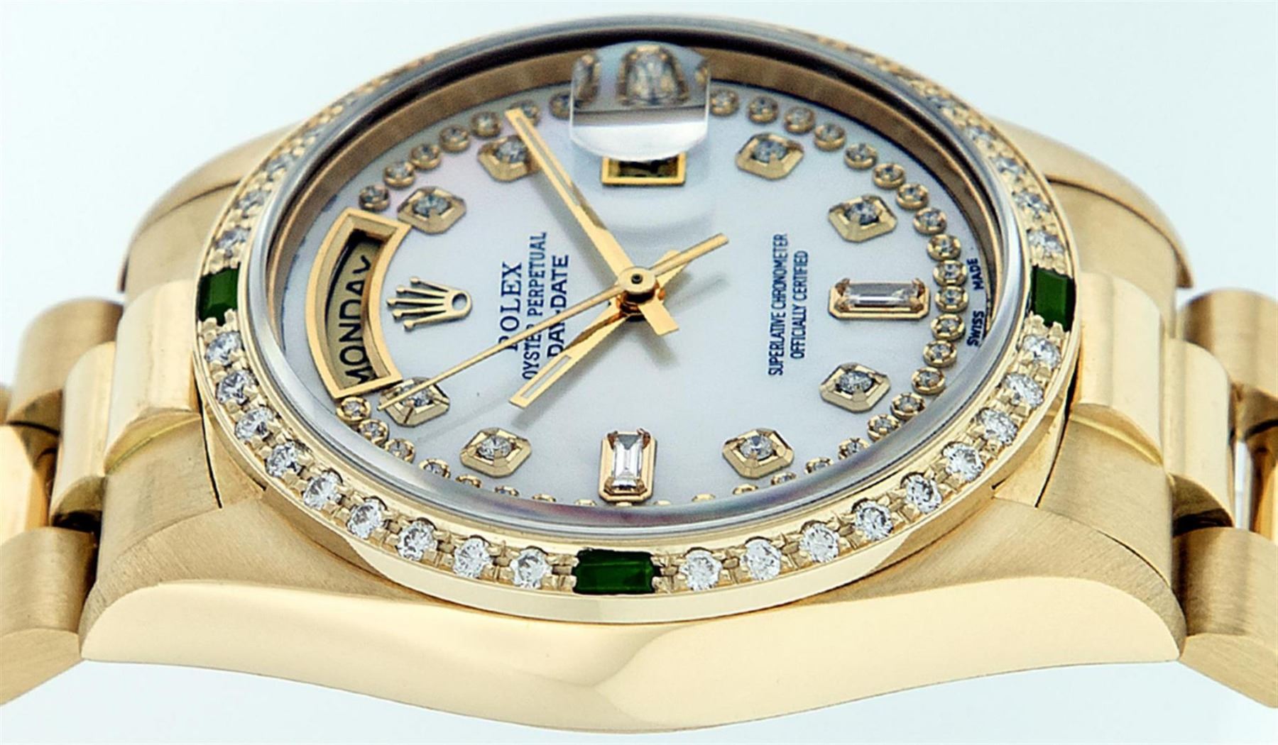 One Mens Rolex Day Date 18K Yellow Gold President Polished, Serviced & Electronically Tested, 18K Yellow Gold Case: 36mm, 18K Yellow Gold Crown, Custom Bezel: New 18K Yellow Gold Beadset + Emerald Diamond Bezel, Diamond + Stone Count: 36 Diamonds + 4 Emeralds On Bezel. Total Weight 1.0 Carat, Clarity: SI-VS, Color: G to H. Custom Crystal: New Scratch Resistant Synthetic Sapphire Cyclops Lens. Custom Hands: New Luminescent Hands. Movement: Automatic Winding Movement Caliber 3055. Custom Dial: Refinished Mother Of Pearl String Diamond Dial, Diamond Count: 49 Diamonds + 2 Baguettes, Color: G to H, Clarity: SI-VS. Date Window: 3 O'Clock Position Date Display, Day Window: 12 O'Clock Position Date Display. Quickset, Model: Day Date President. Condition: G-6 Extra Fine The Watch Is In Very Good Condition Free Of All Scratches And Dents. Bracelet: 18K Yellow Gold President Band. Bright Polish. 6.75 Inch Length, Standard Hidden President Clasp President Band, With Rolex Logo.