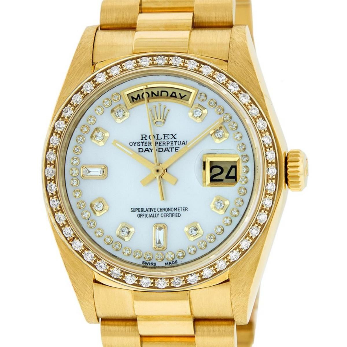 One Mens Rolex Day Date 18K Yellow Gold President Polished, Serviced & Electronically Tested, 18K Yellow Gold Case: 36mm, 18K Yellow Gold Crown, Custom Bezel: New 18K Yellow Gold Beadset Diamond Bezel, Diamond Count 44 Diamonds On Bezel. Total Weight 1.0 Carat, Clarity: SI-VS, Color: G to H. Custom Crystal: New Synthetic Sapphire Cyclops Lens. Custom Hands: New Luminescent Hands. Movement: Automatic Winding Movement Caliber 3055. Custom Dial: Refinished Mother Of Pearl String Diamond Dial, Diamond Count: 49 Diamonds + 2 Baguettes, Color: G to H, Clarity: SI-VS. Date Window: 3 O'Clock Position Date Display, Day Window: 12 O'Clock Position Date Display. Quickset, Model: Day Date President. Condition: G-6 Extra Fine The Watch Is In Very Good Condition Free Of All Scratches And Dents. Bracelet: 18K Yellow Gold President Band. Bright Polish. 7.0 Inch Length, Standard Hidden President Clasp President Band, With Rolex Logo. This Watch Comes With A Rolex Box & Appraisal.