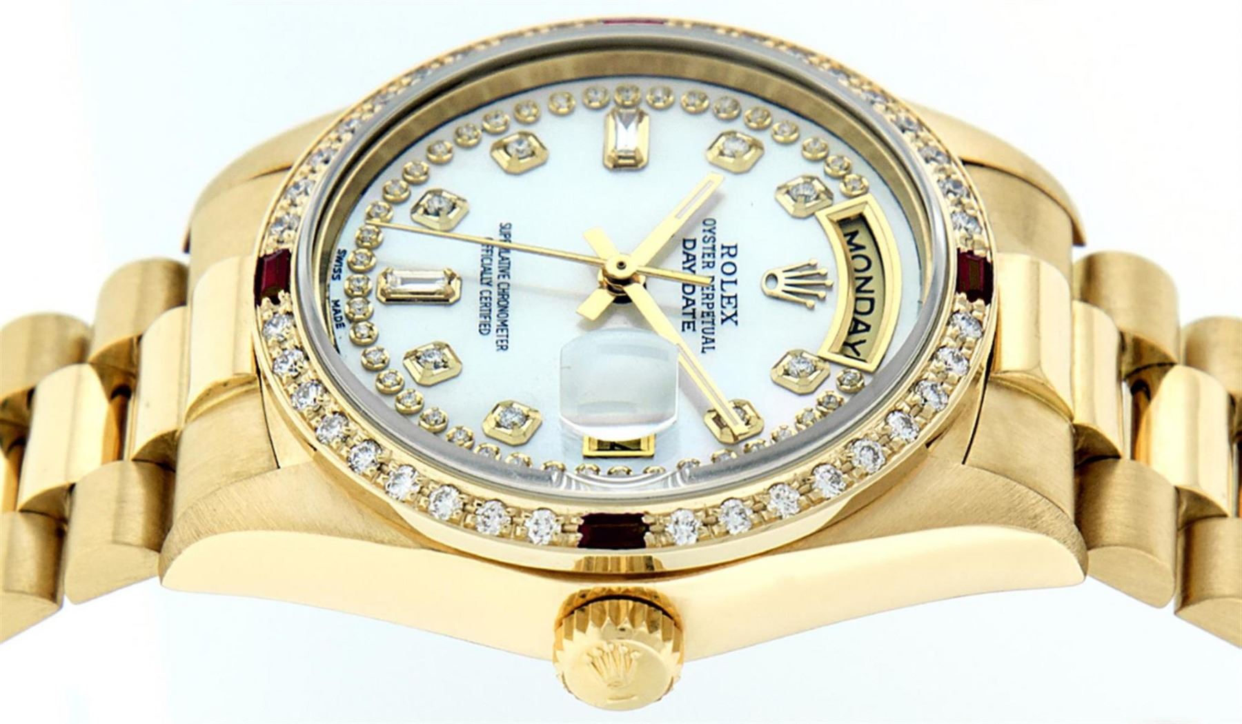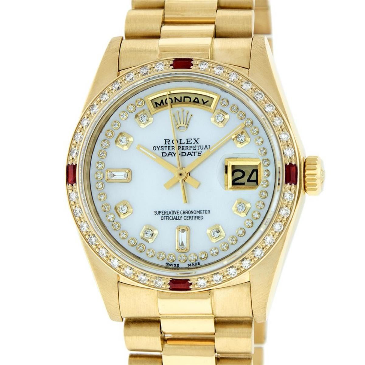 One Mens Rolex Day Date 18K Yellow Gold President Polished, Serviced & Electronically Tested, 18K Yellow Gold Case: 36mm, 18K Yellow Gold Crown, Custom Bezel: New 18K Yellow Gold Beadset + Ruby Diamond Bezel, Diamond + Stone Count: 36 Diamonds + 4 Rubies On Bezel. Total Weight 1.0 Carat, Clarity: SI-VS, Color: G to H. Custom Crystal: New Scratch Resistant Synthetic Sapphire Cyclops Lens. Custom Hands: New Luminescent Hands. Movement: Automatic Winding Movement Caliber 3055. Custom Dial: Refinished Mother Of Pearl String Diamond Dial, Diamond Count: 49 Diamonds + 2 Baguettes, Color: G to H, Clarity: SI-VS. Date Window: 3 O'Clock Position Date Display, Day Window: 12 O'Clock Position Date Display. Quickset, Model: Day Date President. Condition: G-6 Extra Fine The Watch Is In Very Good Condition Free Of All Scratches And Dents. Bracelet: 18K Yellow Gold President Band. Bright Polish. 7.0 Inch Length, Standard Hidden President Clasp President Band, With Rolex Logo. This Watch Comes With A Rolex Box & Appraisal.