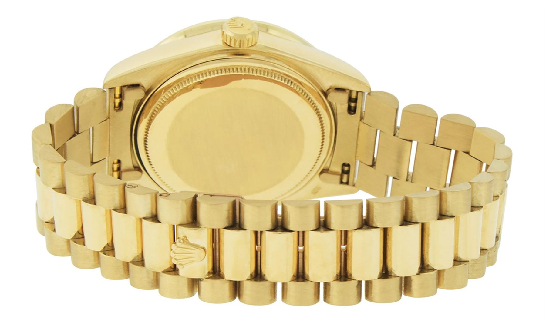 One Mens Pre Owned Rolex Day Date 18K Yellow Gold President Polished, Serviced & Electronically Tested, 18K Yellow Gold Case: 36mm, 18K Yellow Gold Crown, Custom Bezel: New 18K Yellow Gold Beadset + Ruby Diamond Bezel, Diamond + Stone Count: 36 Diamonds + 4 Rubys On Bezel. Custom Crystal: New Sapphire With Magnified Date Window. Rolex Movement: Automatic Winding Movement. Custom Dial: Mother Of Pearl String Diamond Dial, Diamond Count: 49 Diamonds + 2 Baguettes. Date Window: 3 O'Clock Position Date Display, Day Window: 12 O'Clock Position Date Display. Quickset, Model: Day Date President. Condition: G-6 Extra Fine The Watch Is In Very Good Condition Free Of All Scratches And Dents. Rolex Bracelet: 18K Yellow Gold President Band. Bright Polish. 7.0 Inch Length, Standard Hidden President Clasp President Band, With Rolex Logo.