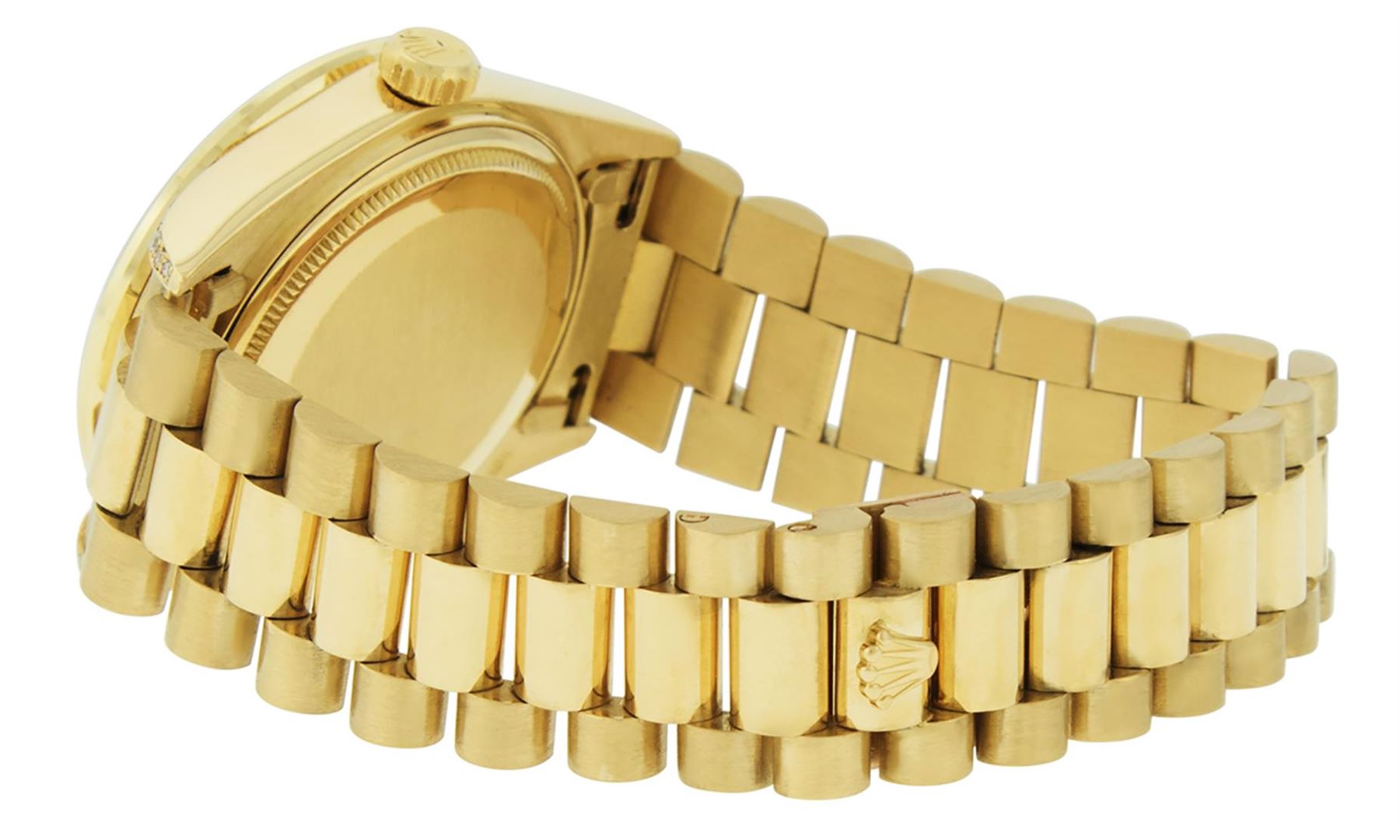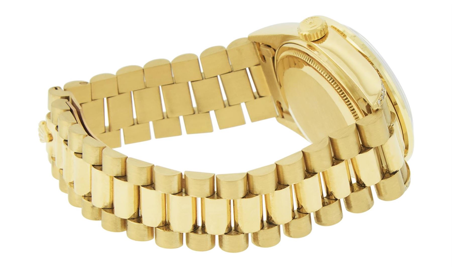 One Mens Pre Owned Rolex Day Date 18K Yellow Gold President Polished, Serviced & Electronically Tested, 18K Yellow Gold Case: 36mm, 18K Yellow Gold Crown, Custom Bezel: New 18K Yellow Gold Beadset + Ruby Diamond Bezel, Diamond + Stone Count: 36 Diamonds + 4 Rubys On Bezel. Custom Crystal: New Sapphire With Magnified Date Window. Rolex Movement: Automatic Winding Movement. Custom Dial: Mother Of Pearl String Diamond Dial, Diamond Count: 49 Diamonds + 2 Baguettes. Date Window: 3 O'Clock Position Date Display, Day Window: 12 O'Clock Position Date Display. Quickset, Model: Day Date President. Condition: G-6 Extra Fine The Watch Is In Very Good Condition Free Of All Scratches And Dents. Rolex Bracelet: 18K Yellow Gold President Band. Bright Polish. 7.0 Inch Length, Standard Hidden President Clasp President Band, With Rolex Logo.