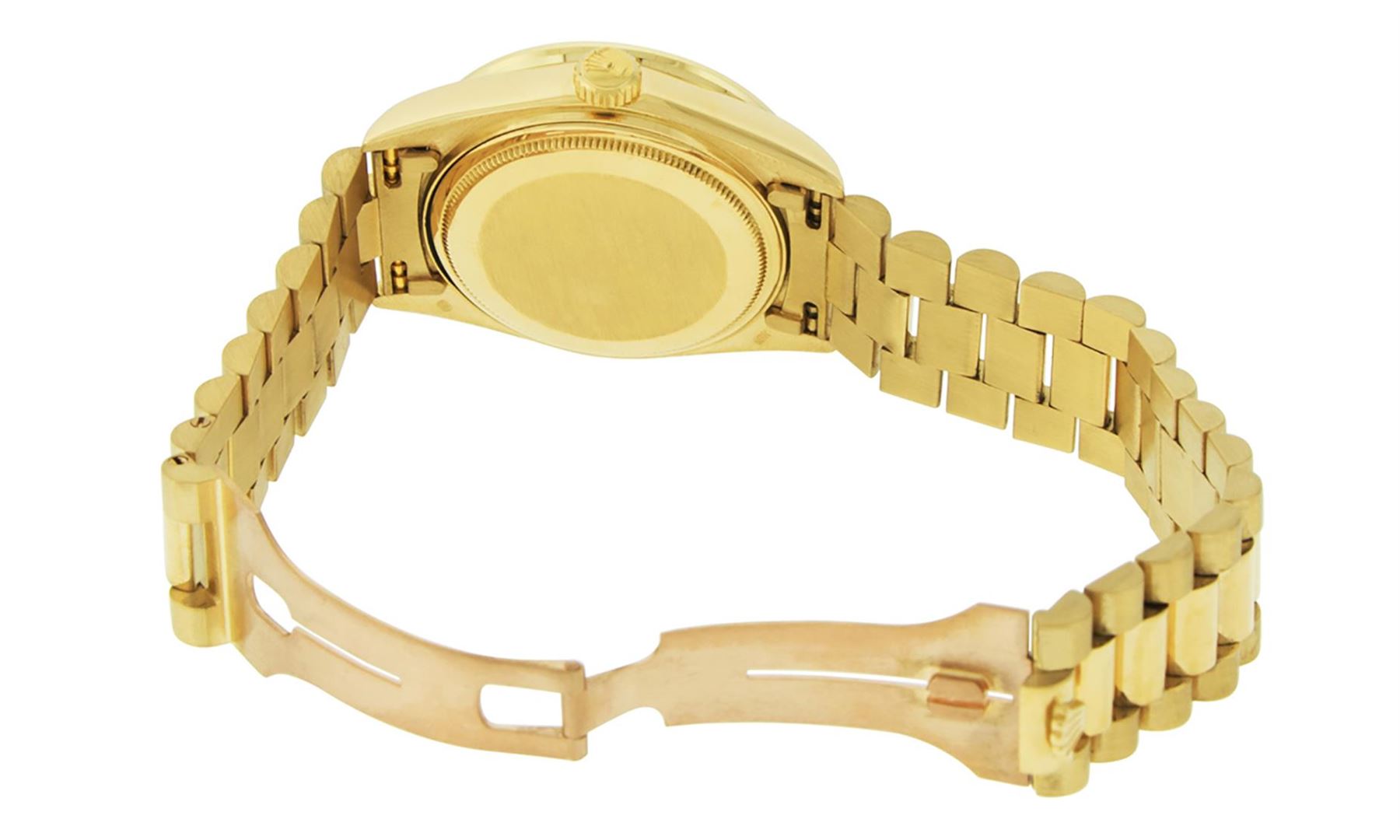 One Mens Pre Owned Rolex Day Date 18K Yellow Gold President Polished, Serviced & Electronically Tested, 18K Yellow Gold Case: 36mm, 18K Yellow Gold Crown, Custom Bezel: New 18K Yellow Gold Beadset + Ruby Diamond Bezel, Diamond + Stone Count: 36 Diamonds + 4 Rubys On Bezel. Custom Crystal: New Sapphire With Magnified Date Window. Rolex Movement: Automatic Winding Movement. Custom Dial: Mother Of Pearl String Diamond Dial, Diamond Count: 49 Diamonds + 2 Baguettes. Date Window: 3 O'Clock Position Date Display, Day Window: 12 O'Clock Position Date Display. Quickset, Model: Day Date President. Condition: G-6 Extra Fine The Watch Is In Very Good Condition Free Of All Scratches And Dents. Rolex Bracelet: 18K Yellow Gold President Band. Bright Polish. 7.0 Inch Length, Standard Hidden President Clasp President Band, With Rolex Logo.