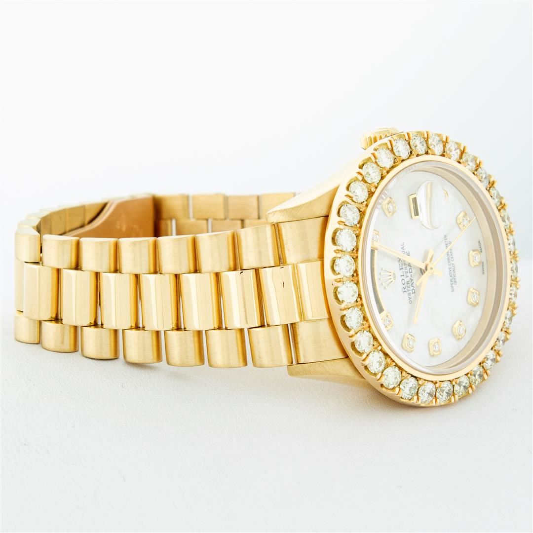 One Mens Pre Owned Rolex Day Date 18K Yellow Gold President Polished, Serviced & Electronically Tested, 18K Yellow Gold Case: 36mm, 18K Yellow Gold Crown, Custom Bezel: New 18K Yellow Gold Bead-set Diamond Bezel, Diamond Count: 48 Diamonds On Bezel. Total Weight 4.25 Carat. Custom Crystal: New Sapphire With Magnified Date Window. Custom Hands: New Luminescent Hands. Rolex Movement: Automatic Winding Movement. Custom Dial: Mother Of Pearl With Custom Added Diamond Hour Markers, Diamond Count: 10 Diamonds On Dial. Date Window: 3 O'Clock Position Date Display, Day Window: 12 O'Clock Position Date Display. Quickset, Model: Day Date President. Condition: G-6 Extra Fine The Watch Is In Very Good Condition Free Of All Scratches And Dents. Rolex Bracelet: 18K Yellow Gold President. Bright Polish. 7.0 Inch Length, Standard Hidden President Clasp President Band, With Rolex Logo.