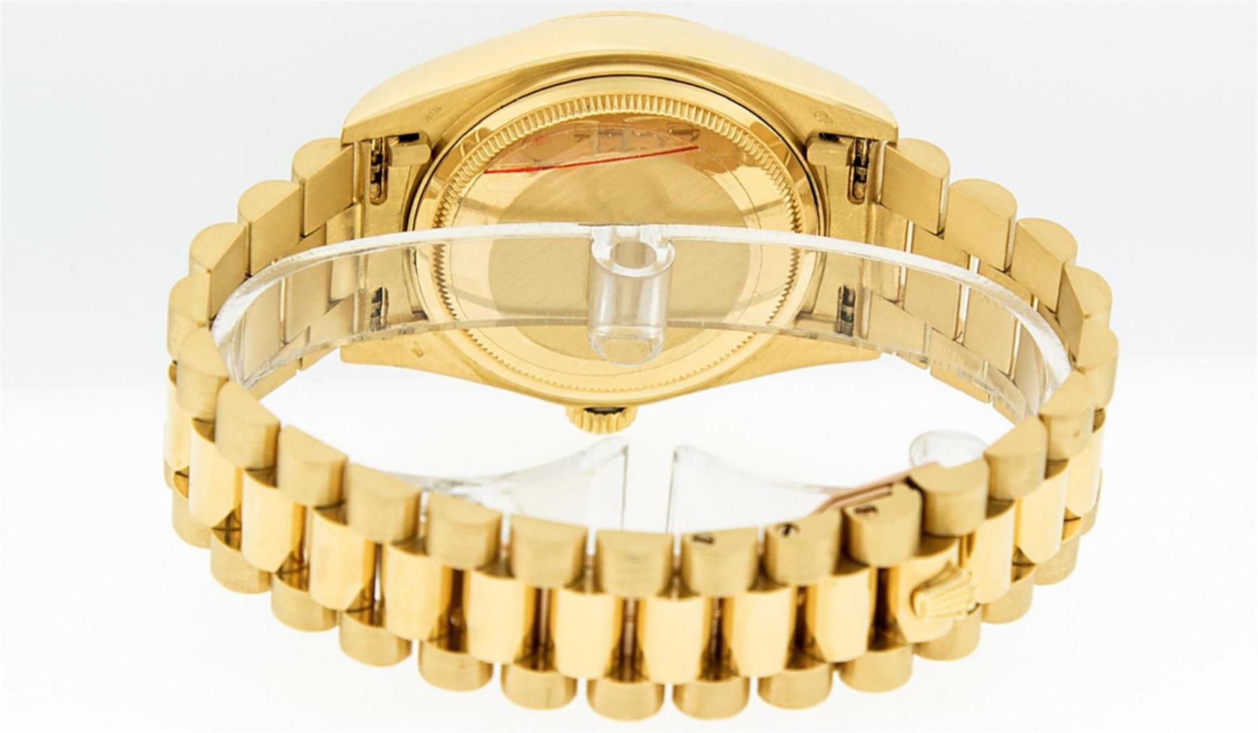 One Mens Quickset Rolex Day Date 18K Yellow Gold President Polished, Serviced & Electronically Tested, 18K Yellow Gold Case: 36mm, 18K Yellow Gold Crown, Bezel: 18K Yellow Gold Fluted Bezel. Custom Crystal: New Scratch Resistant Synthetic Sapphire Cyclops Lens. Custom Hands: New Luminescent Hands. Movement: Automatic Quickset Winding Movement Caliber 3055. Custom Dial: Refinished Mother Of Pearl String Single Cut Diamond Dial, Diamond Count: 49 Diamonds + 2 Diamond Baguettes, Color: G To H, Clarity: SI - VS, Date Window: 3 O'Clock Position, Day Display: 12 O'Clock Position, Single Quickset, Model: Day Date President. Condition: G-6 Extra Fine. Bracelet: 18K Yellow Gold President Band With Hidden Clasp, Bright & Satin Polish. 7.0 Inch Length, Standard President Clasp, With Rolex Logo.
