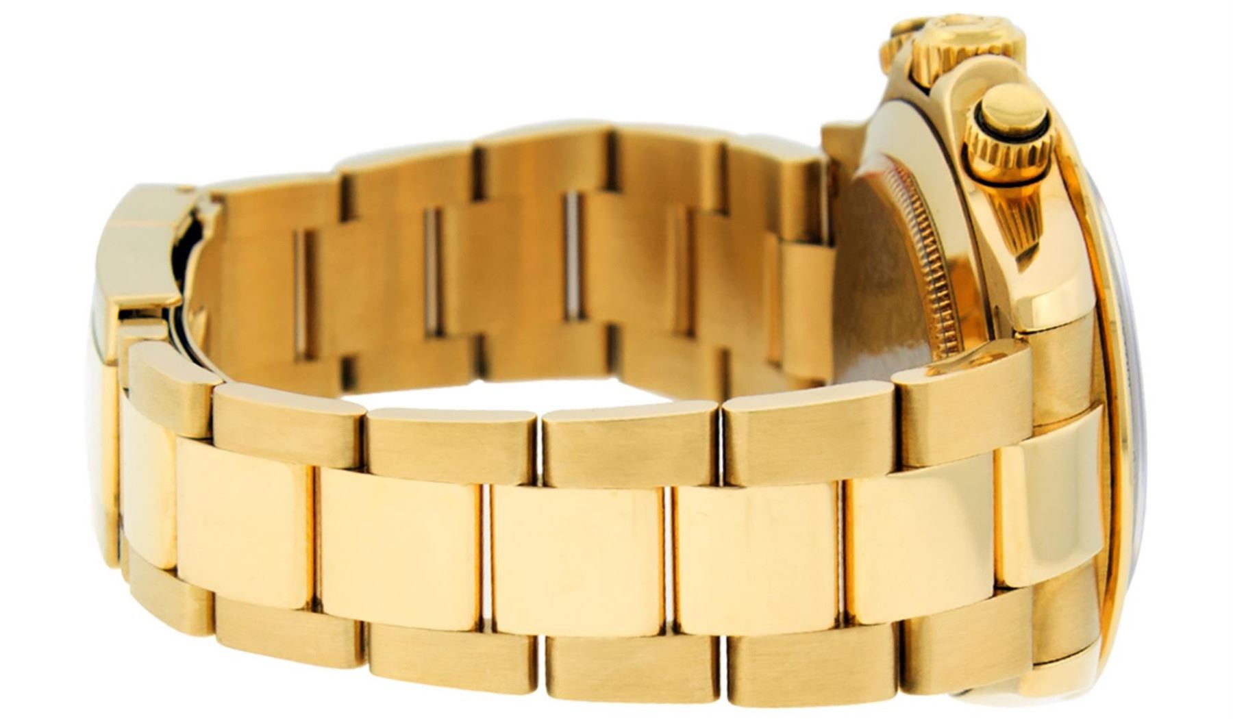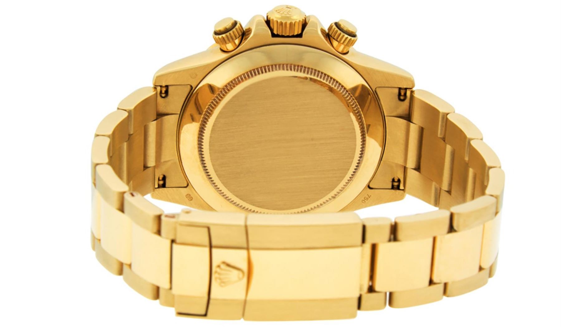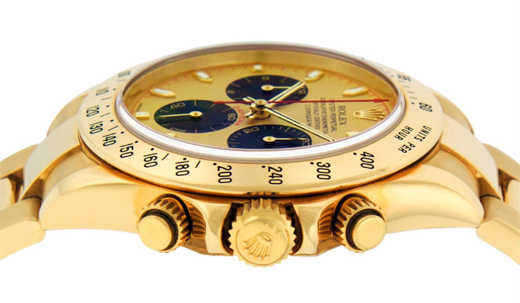 One Mens Pre Owned Rolex 18K Yellow Gold Daytona "Paul Newman" Champagne Dial, Polished, Serviced & Electronically Tested, Yellow Gold Case: 40mm, 18K Yellow Gold Crown, Bezel: 18K Yellow Gold Tachymeter Bezel. Crystal: Sapphire. Rolex Movement: Automatic Winding Movement Caliber 4130. Dial: Rolex Paul Newman Champagne Dial with Black Subdials, Yellow Gold Luminescent Hands and Hour Markers, Red Subsidiary Seconds Hand. Chronograph Function: Red Central Chronograph Second Hand, 30 Minute Counter Sub-Dial at 3 O'Clock, 12 Hour Counter Sub-Dial at 9 O'Clock, Small Second Sub-Dial at 6 O'Clock, Model: Daytona 116528, Condition: G-6 Extra Fine. Bracelet: 18K Yellow Gold Oyster Band with Folding Oysterlock Safety Clasp with Easylink Extension 7.50 Inch Length, Bright Polish & Satin Finish. This Watch Has Been Serviced Time Tested And Is In Excellent Condition It Is Free Of All Scratches And Dents.