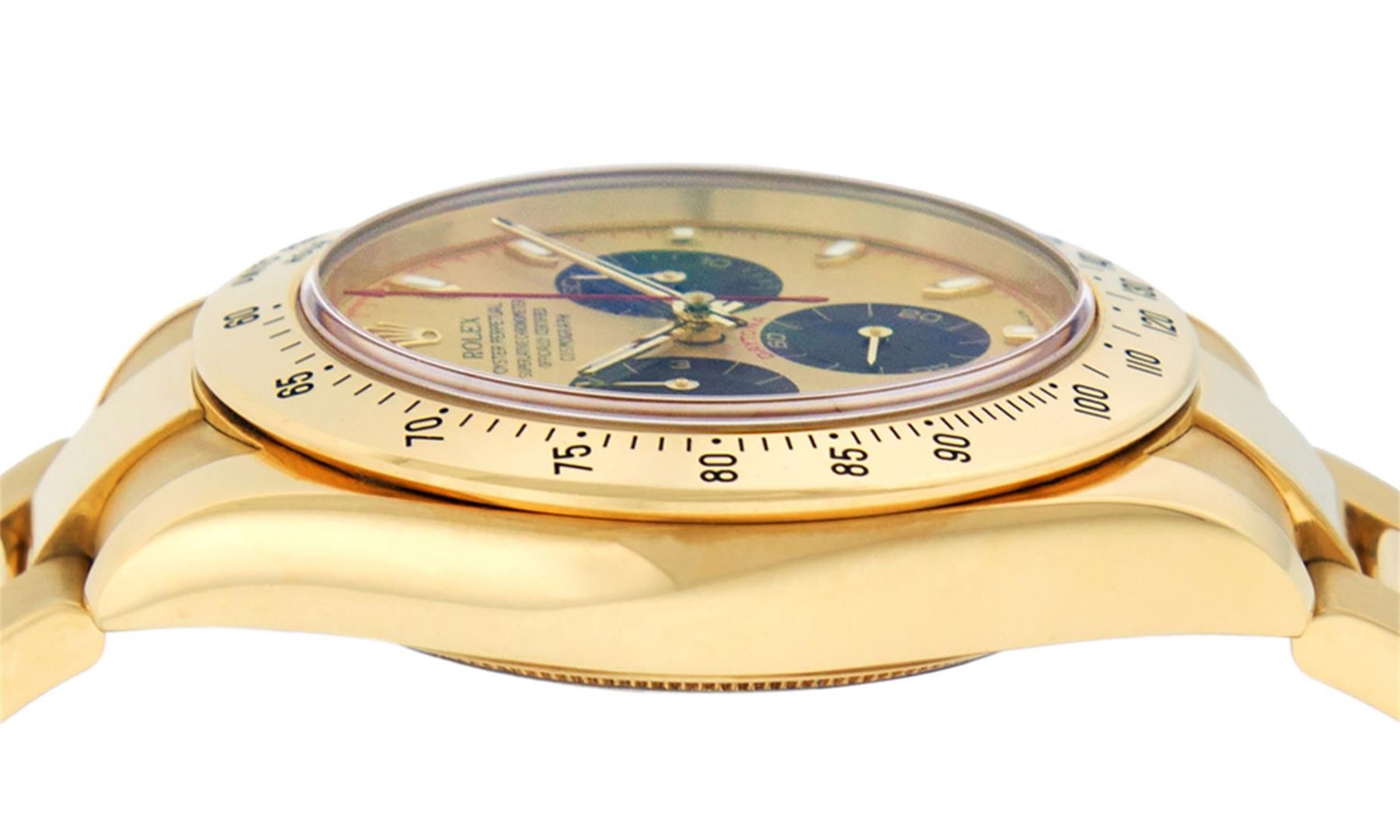One Mens Pre Owned Rolex 18K Yellow Gold Daytona "Paul Newman" Champagne Dial, Polished, Serviced & Electronically Tested, Yellow Gold Case: 40mm, 18K Yellow Gold Crown, Bezel: 18K Yellow Gold Tachymeter Bezel. Crystal: Sapphire. Rolex Movement: Automatic Winding Movement Caliber 4130. Dial: Rolex Paul Newman Champagne Dial with Black Subdials, Yellow Gold Luminescent Hands and Hour Markers, Red Subsidiary Seconds Hand. Chronograph Function: Red Central Chronograph Second Hand, 30 Minute Counter Sub-Dial at 3 O'Clock, 12 Hour Counter Sub-Dial at 9 O'Clock, Small Second Sub-Dial at 6 O'Clock, Model: Daytona 116528, Condition: G-6 Extra Fine. Bracelet: 18K Yellow Gold Oyster Band with Folding Oysterlock Safety Clasp with Easylink Extension 7.50 Inch Length, Bright Polish & Satin Finish. This Watch Has Been Serviced Time Tested And Is In Excellent Condition It Is Free Of All Scratches And Dents.