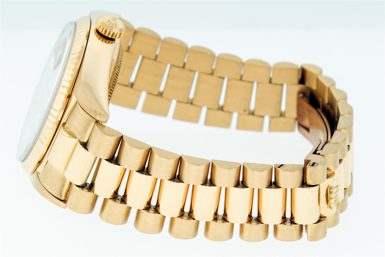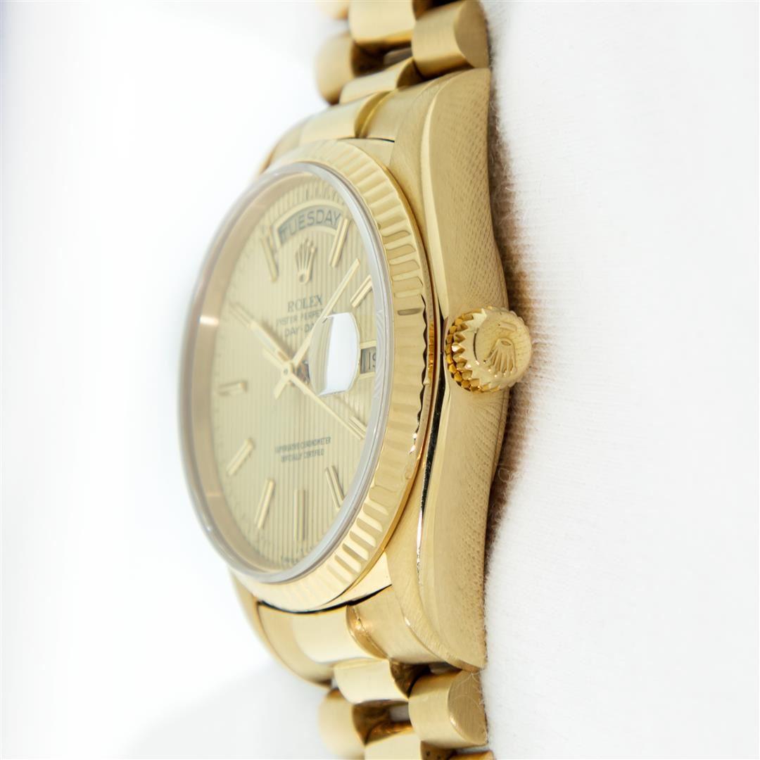 One Mens Pre Owned Quickset Rolex Day Date 18K Yellow Gold President Polished, Serviced & Electronically Tested, Rolex 18K Yellow Gold Case: 36mm, Rolex 18K Yellow Gold Crown, Rolex Bezel: 18K Yellow Gold Fluted Bezel. Crystal: Sapphire With Cyclops Lens. Rolex Movement: Automatic Quickset Winding Movement Caliber 3055. Rolex Dial: Factory Champagne Tapestry Index Dial With Dash Track. Date Window: 3 O'Clock Position, Day Display: 12 O'Clock Position, Single Quickset, Model: Day Date President. Condition: G-6 Extra Fine. Rolex Bracelet: 18K Yellow Gold President Band With Hidden Clasp, Bright & Satin Polish. 7.0 Inch Length, Standard President Clasp, With Rolex Logo. This Watch Comes With A Rolex Box.