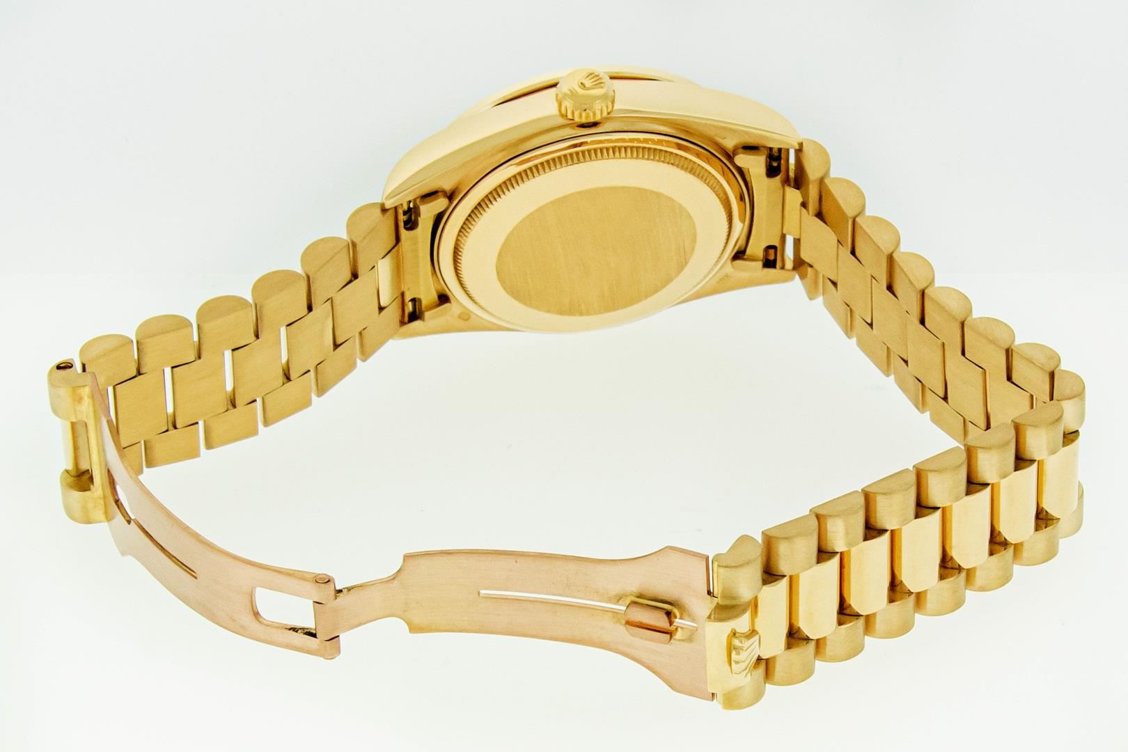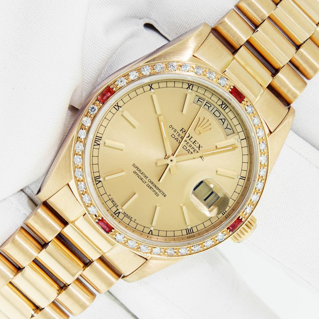 One Mens Pre Owned Quickset Rolex Day Date 18K Yellow Gold President Polished, Serviced & Electronically Tested, Rolex 18K Yellow Gold Case: 36mm, Rolex 18K Yellow Gold Crown, Custom Bezel: New 18K Yellow Gold Beadset Diamond & Ruby Bezel, Diamond Count: 36 Diamonds + 4 Rubies On Bezel. Custom Crystal: New Sapphire With Magnified Date Window. Rolex Movement: Automatic Quickset Winding Movement Caliber 3055. Rolex Dial: Champagne Index With Roman Track & Lumi Dots. Custom Hands: New Hands. Date Window: 3 O'Clock Position, Day Display: 12 O'Clock Position, Single Quickset, Model: Day Date President. Condition: G-6 Extra Fine. Rolex Bracelet: 18K Yellow Gold President Band With Hidden Clasp, Bright & Satin Polish. 7.0 Inch Length, Standard President Clasp, With Rolex Logo. This Watch Has Been Serviced And Polished It Is Free Of All Scratches And Dents.