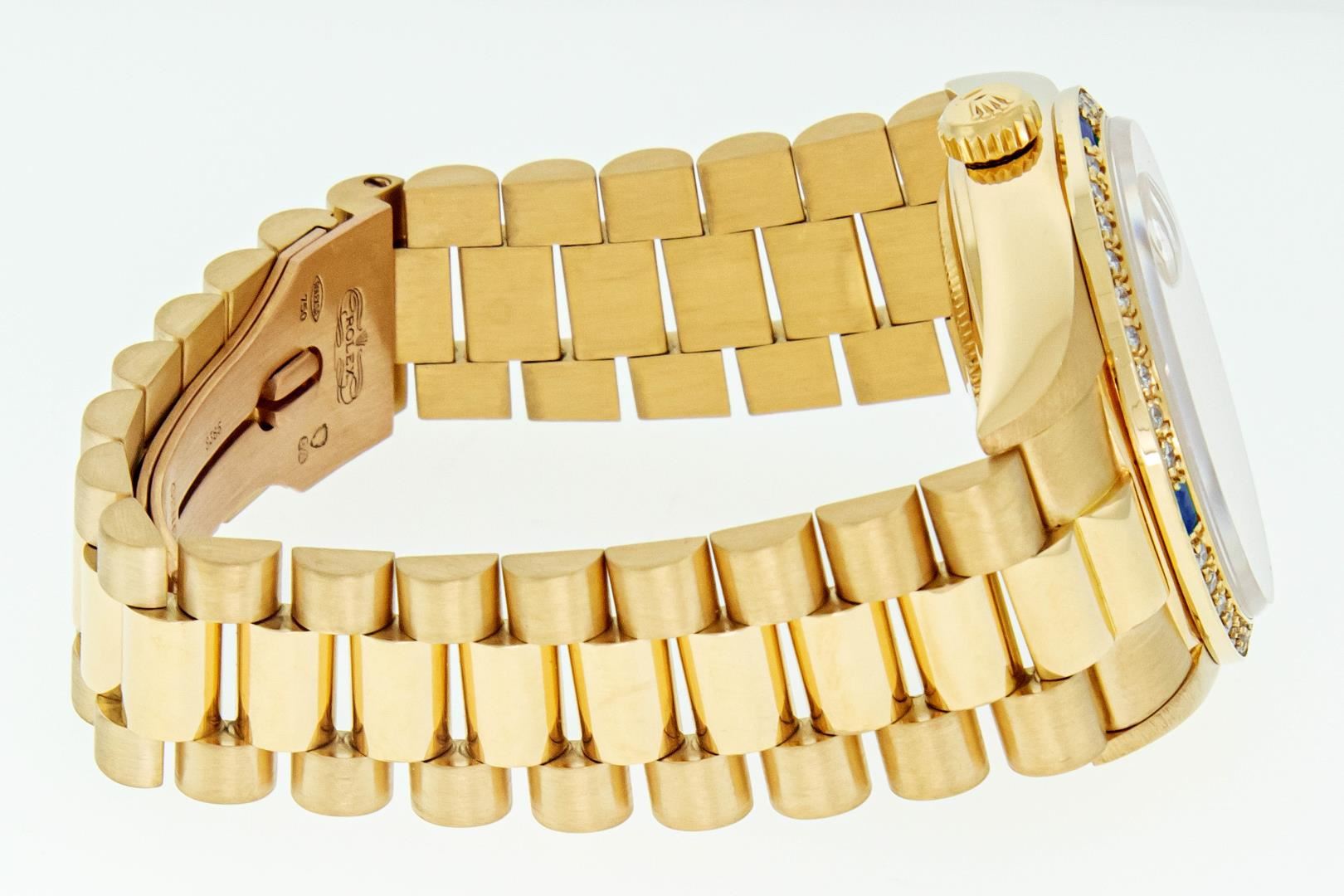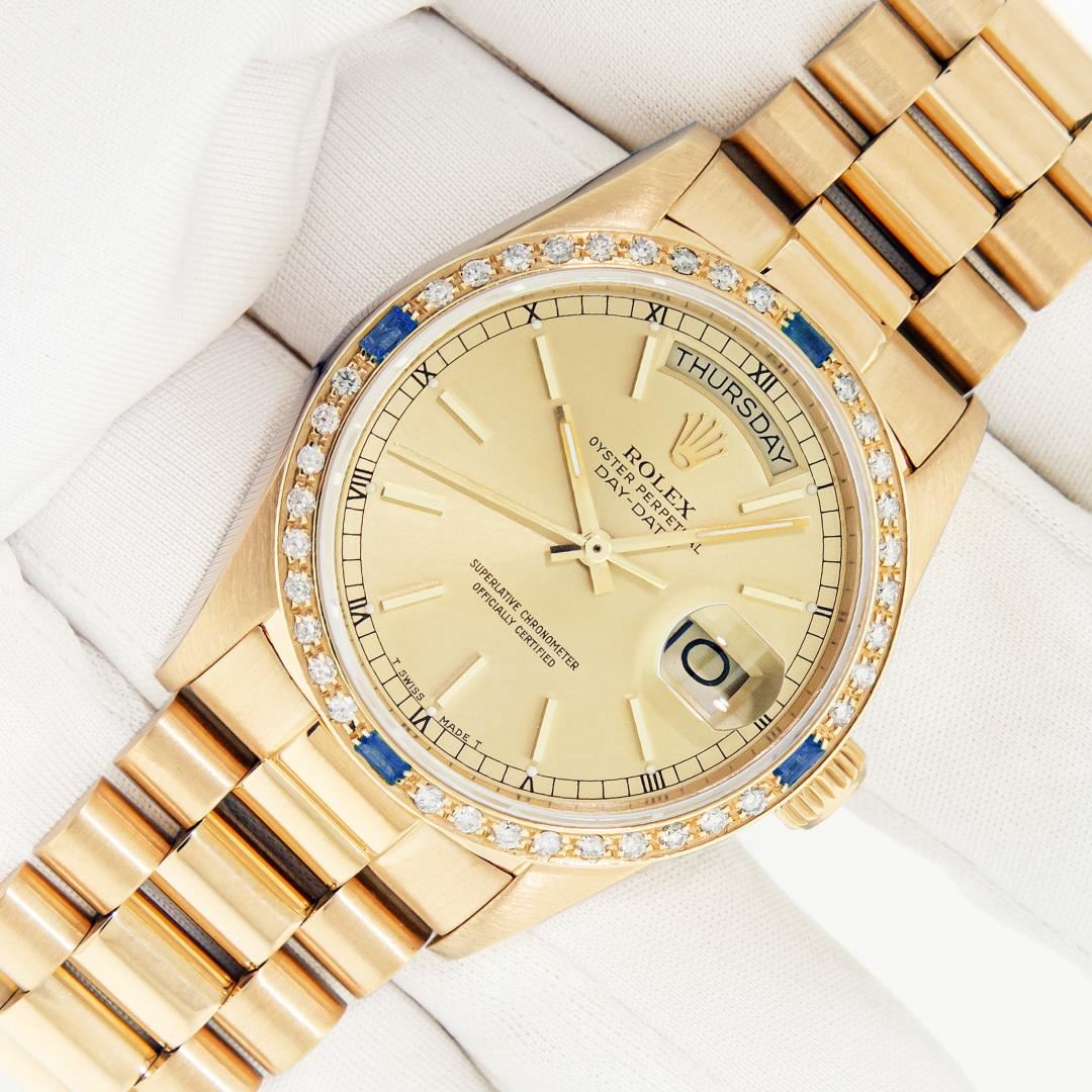 One Mens Pre Owned Quickset Rolex Day Date 18K Yellow Gold President Polished, Serviced & Electronically Tested, Rolex 18K Yellow Gold Case: 36mm, Rolex 18K Yellow Gold Crown, Custom Bezel: New 18K Yellow Gold Beadset Diamond & Sapphire Bezel, Diamond Count: 36 Diamonds + 4 Sapphires On Bezel. Custom Crystal: New Sapphire With Magnified Date Window. Rolex Movement: Automatic Quickset Winding Movement Caliber 3055. Rolex Dial: Champagne Index With Roman Track & Lumi Dots. Custom Hands: New Hands. Date Window: 3 O'Clock Position, Day Display: 12 O'Clock Position, Single Quickset, Model: Day Date President. Condition: G-6 Extra Fine. Rolex Bracelet: 18K Yellow Gold President Band With Hidden Clasp, Bright & Satin Polish. 7.0 Inch Length, Standard President Clasp, With Rolex Logo. This Watch Has Been Serviced And Polished It Is Free Of All Scratches And Dents.