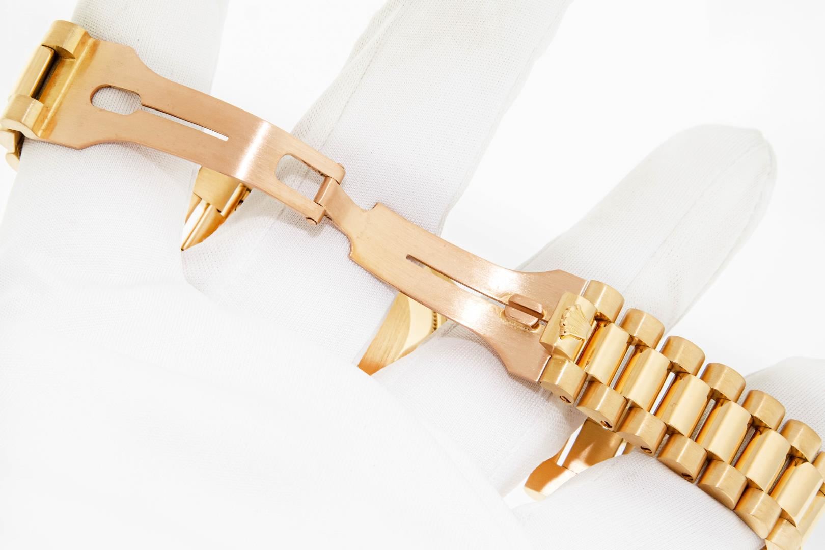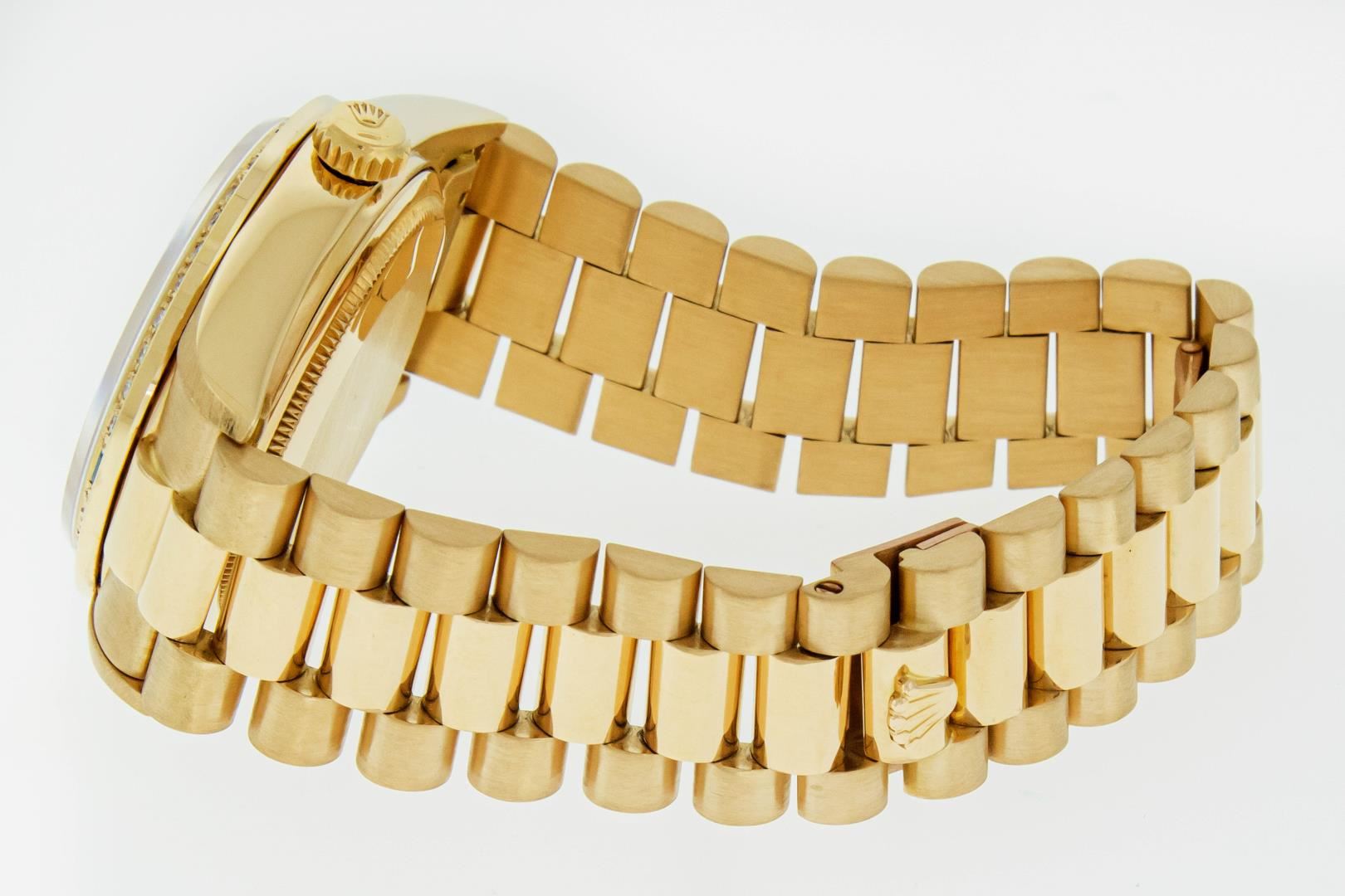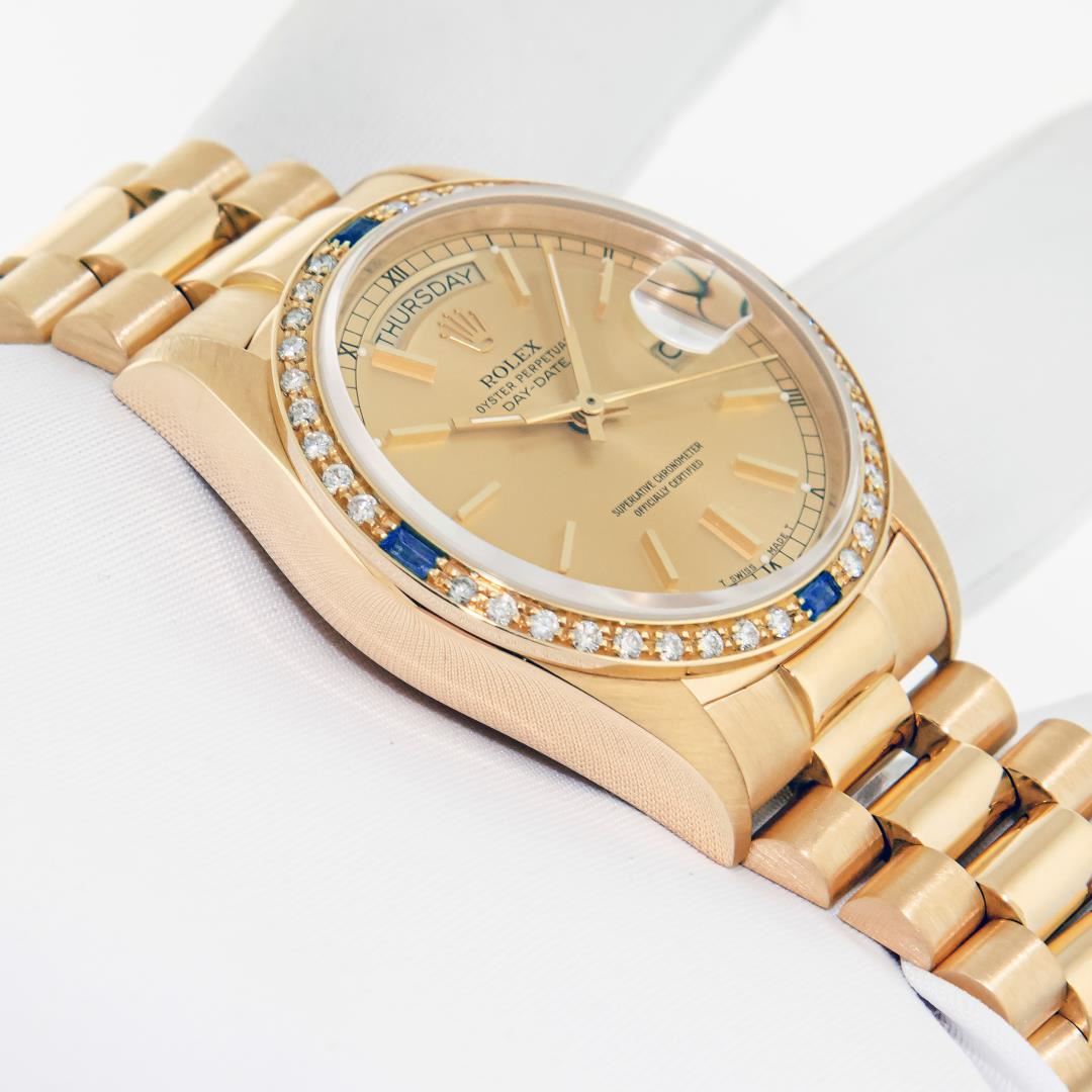 One Mens Pre Owned Quickset Rolex Day Date 18K Yellow Gold President Polished, Serviced & Electronically Tested, Rolex 18K Yellow Gold Case: 36mm, Rolex 18K Yellow Gold Crown, Custom Bezel: New 18K Yellow Gold Beadset Diamond & Sapphire Bezel, Diamond Count: 36 Diamonds + 4 Sapphires On Bezel. Custom Crystal: New Sapphire With Magnified Date Window. Rolex Movement: Automatic Quickset Winding Movement Caliber 3055. Rolex Dial: Champagne Index With Roman Track & Lumi Dots. Custom Hands: New Hands. Date Window: 3 O'Clock Position, Day Display: 12 O'Clock Position, Single Quickset, Model: Day Date President. Condition: G-6 Extra Fine. Rolex Bracelet: 18K Yellow Gold President Band With Hidden Clasp, Bright & Satin Polish. 7.0 Inch Length, Standard President Clasp, With Rolex Logo. This Watch Has Been Serviced And Polished It Is Free Of All Scratches And Dents.