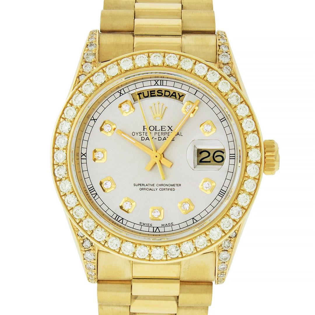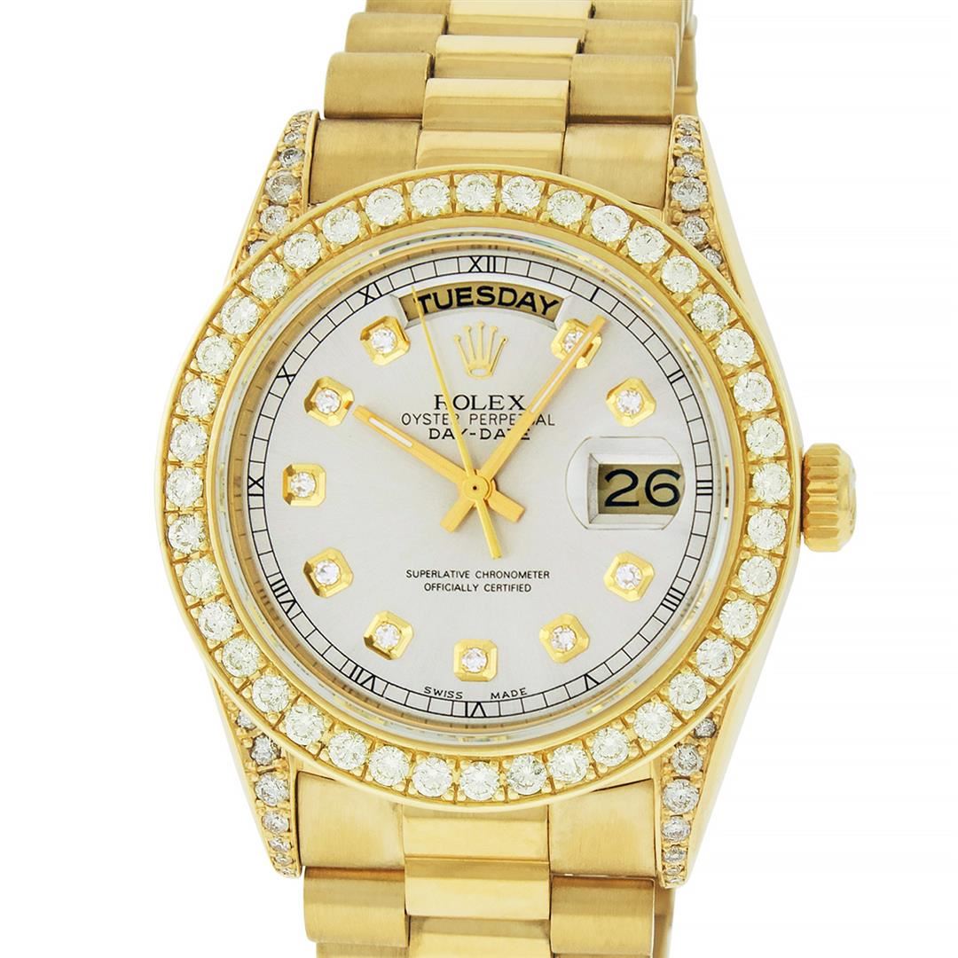 One Mens Pre Owned Rolex Day Date 18K Yellow Gold President Polished, Serviced & Electronically Tested, 18K Yellow Gold Case: 36mm, 18K Yellow Gold Crown, Custom Bezel: New 18K Yellow Gold 2.6ctw Beadset Diamond Bezel, Diamond Count: 40 Diamonds On Bezel. Total Bezel Weight 2.6 Carat. Custom Crystal: New Sapphire With Magnified Date Window. Rolex Movement: Automatic Winding Movement. Custom Dial: Refinished To Silver With Custom Added Diamonds, Diamond Count: 10 Diamonds. Date Window: 3 O'Clock Position Date Display, Day Window: 12 O'Clock Position Date Display. Quickset, Model: Day Date President. Condition: G-6 Extra Fine The Watch Is In Very Good Condition Free Of All Scratches And Dents. Rolex Bracelet: 18K Yellow Gold President Band. Bright Polish. 7.0 Inch Length, Standard Hidden President Clasp President Band, With Rolex Logo.