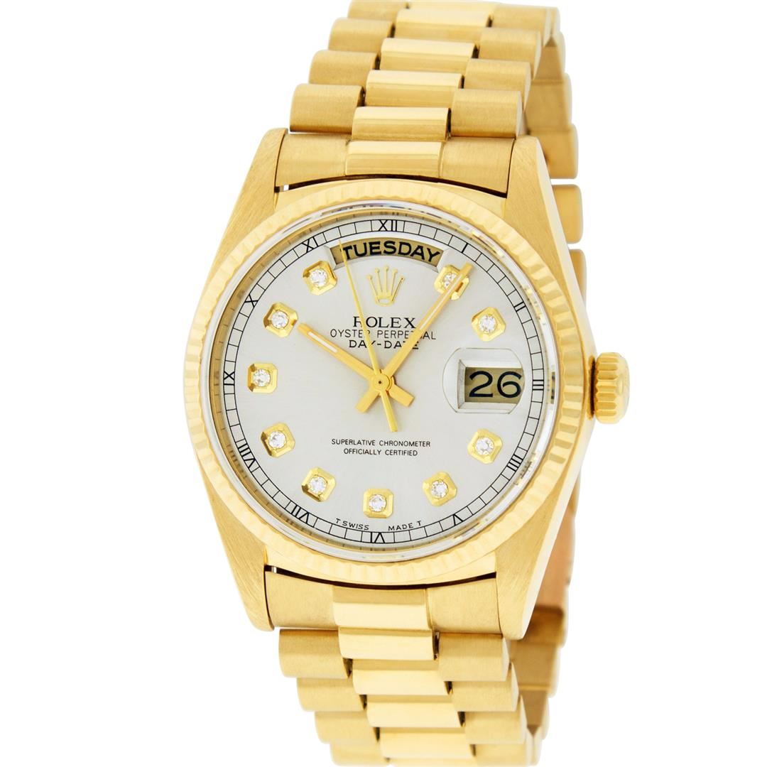 One Mens Quickset Rolex Day Date 18K Yellow Gold President Polished, Serviced & Electronically Tested, 18K Yellow Gold Case: 36mm, 18K Yellow Gold Crown, Bezel: 18K Yellow Gold Fluted Bezel. Custom Crystal: New Scratch Resistant Synthetic Sapphire Cyclops Lens. Custom Hands: New Luminescent Hands. Movement: Automatic Quickset Winding Movement Caliber 3055. Custom Dial: Refinished Silver Single Cut Diamond Dial, Diamond Count: 10 Diamonds On Dial, Color: G To H, Clarity: SI-VS. Date Window: 3 O'Clock Position, Day Display: 12 O'Clock Position, Single Quickset, Model: Day Date President. Condition: G-6 Extra Fine. Bracelet: 18K Yellow Gold President Band With Hidden Clasp, Bright & Satin Polish. 7.0 Inch Length, Standard President Clasp, With Rolex Logo. This Watch Comes With A Rolex Box & Appraisal.