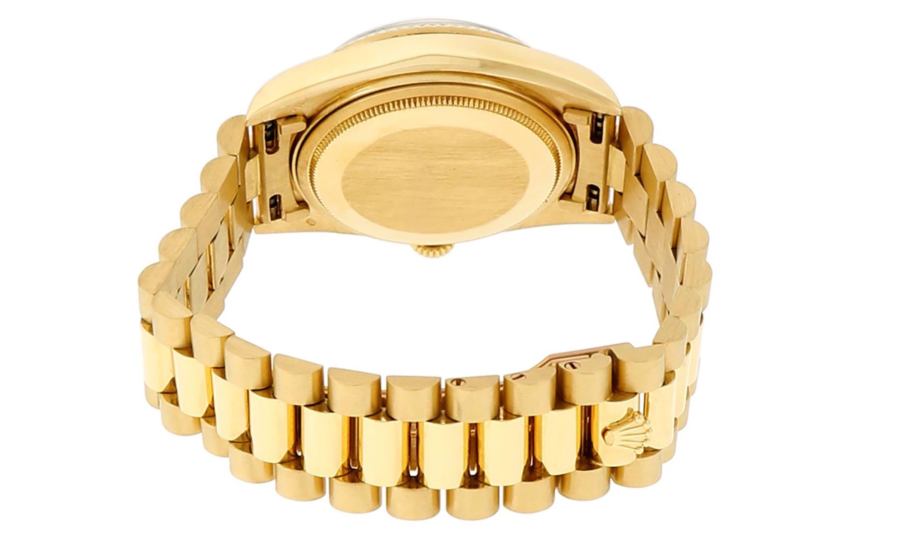 One Mens Quickset Rolex Day Date 18K Yellow Gold President Polished, Serviced & Electronically Tested, 18K Yellow Gold Case: 36mm, 18K Yellow Gold Crown, Bezel: 18K Yellow Gold Fluted Bezel. Custom Crystal: New Scratch Resistant Synthetic Sapphire Cyclops Lens. Custom Hands: New Luminescent Hands. Movement: Automatic Quickset Winding Movement Caliber 3055. Custom Dial: Refinished Silver Single Cut Diamond Dial, Diamond Count: 10 Diamonds On Dial, Color: G To H, Clarity: SI-VS. Date Window: 3 O'Clock Position, Day Display: 12 O'Clock Position, Single Quickset, Model: Day Date President. Condition: G-6 Extra Fine. Bracelet: 18K Yellow Gold President Band With Hidden Clasp, Bright & Satin Polish. 7.0 Inch Length, Standard President Clasp, With Rolex Logo. This Watch Comes With A Rolex Box & Appraisal.