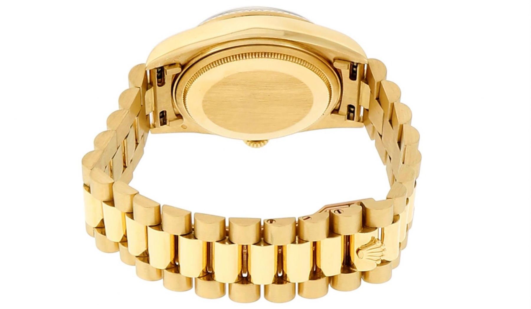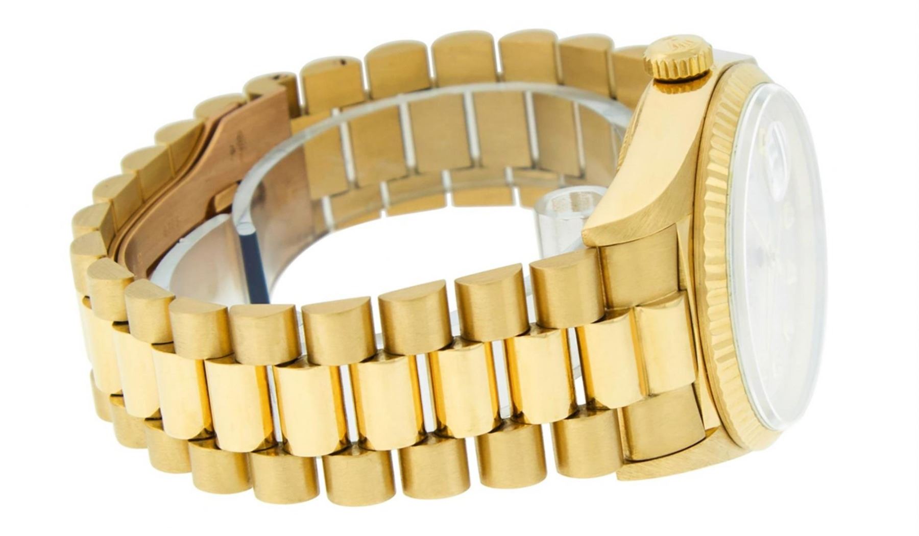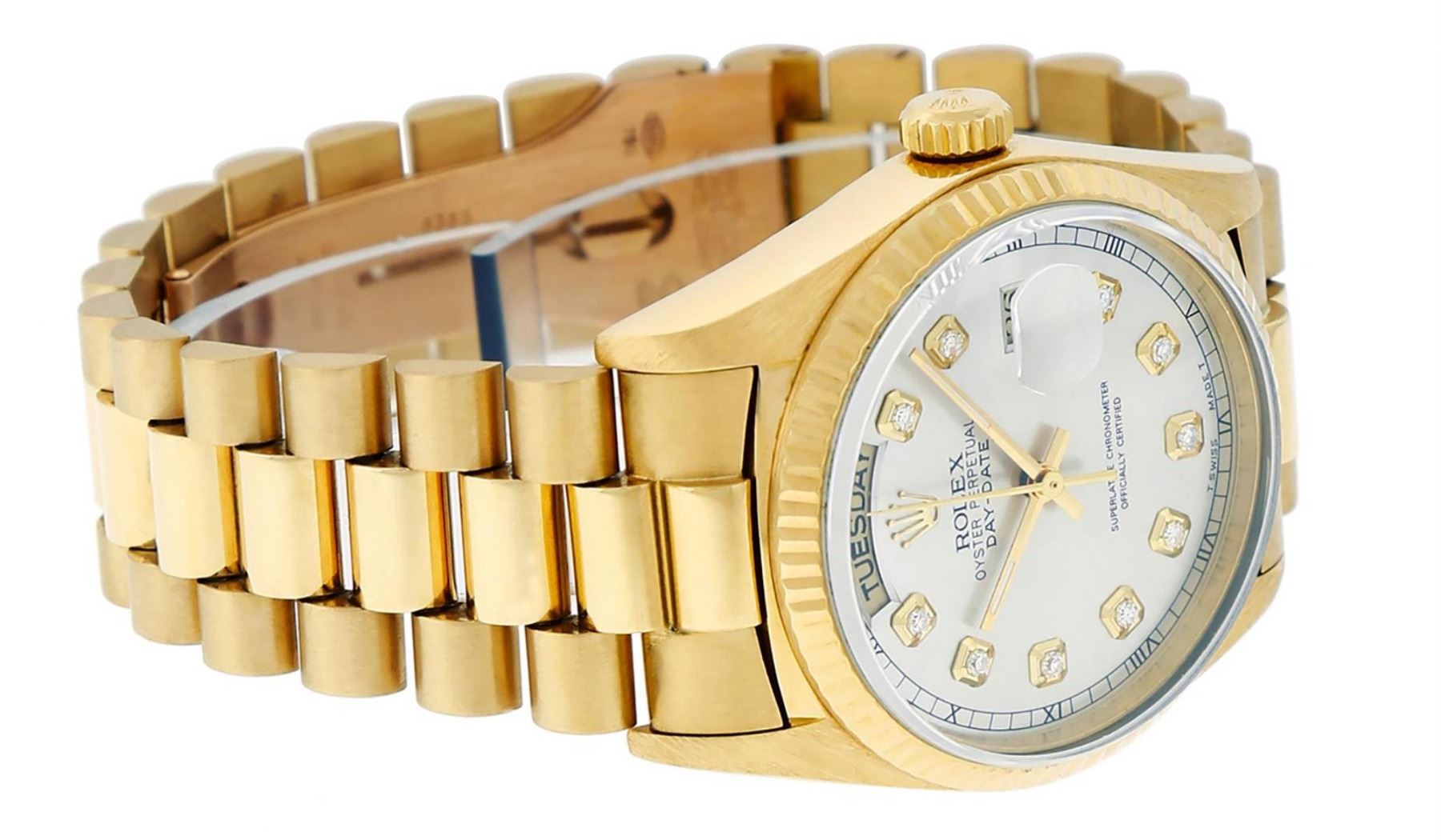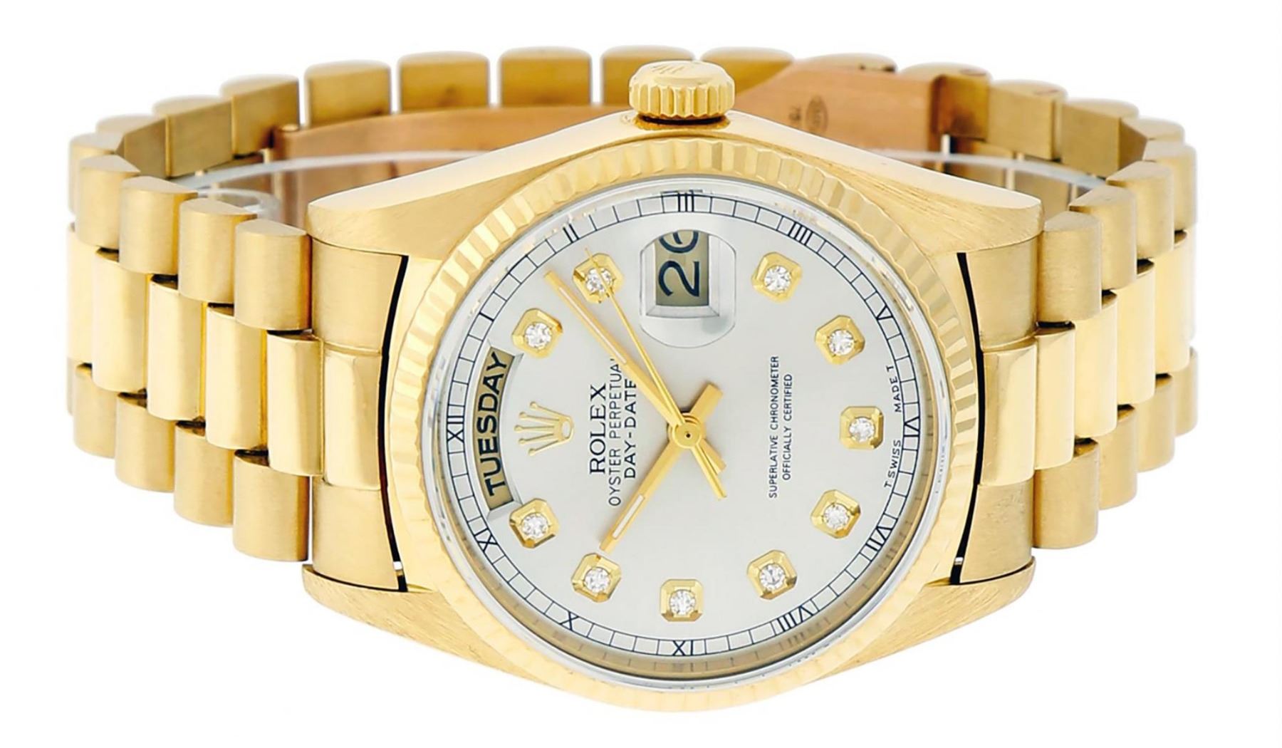 One Mens Quickset Rolex Day Date 18K Yellow Gold Presidential Polished, Serviced & Electronically Tested, 18K Yellow Gold Case: 36mm, 18K Yellow Gold Crown, Bezel: 18K Yellow Gold Fluted Bezel. Custom Crystal: New Scratch Resistant Synthetic Sapphire Cyclops Lens. Custom Hands: New Luminescent Hands. Movement: Automatic Quickset Winding Movement Caliber 3055. Custom Dial: Refinished Silver Single Cut Diamond Dial, Diamond Count: 10 Diamonds On Dial, Color: G To H, Clarity: SI-VS. Date Window: 3 O'Clock Position, Day Display: 12 O'Clock Position, Single Quickset, Model: Day Date President. Condition: G-6 Extra Fine. Bracelet: 18K Yellow Gold President Band With Hidden Clasp, Bright & Satin Polish. 7.0 Inch Length, Standard President Clasp, With Rolex Logo. This Watch Comes With A Rolex Box.