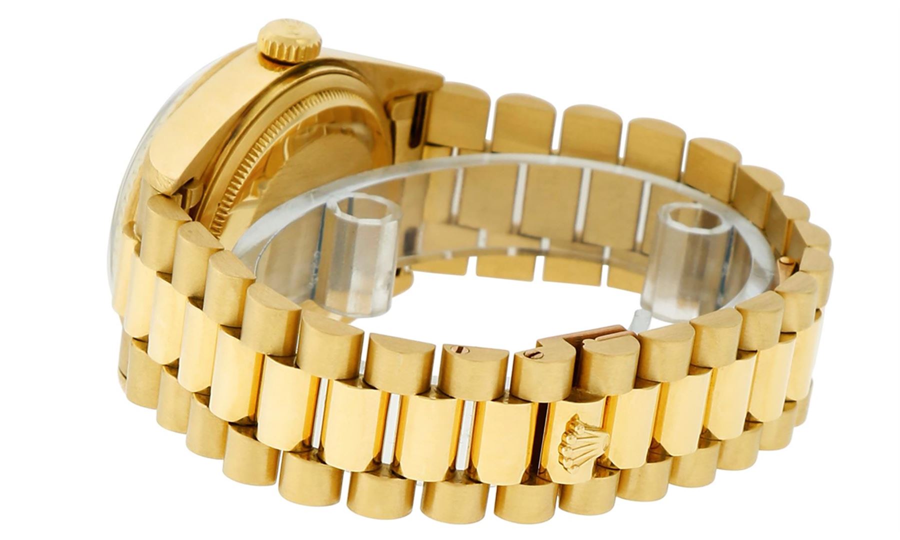 One Mens Pre Owned Quickset Rolex Day Date 18K Yellow Gold Presidential Polished, Serviced & Electronically Tested, Rolex 18K Yellow Gold Case: 36mm, Rolex 18K Yellow Gold Crown, Rolex Bezel: 18K Yellow Gold Fluted Bezel. Custom Crystal: New Scratch Resistant Synthetic Sapphire Cyclops Lens. Custom Hands: New Luminescent Hands. Rolex Movement: Automatic Quickset Winding Movement Caliber 3055. Custom Dial: Refinished To Silver With Custom Added Genuine Single Cut Diamonds, Diamond Count: 10 Diamonds On Dial, Color: G To H, Clarity: SI-VS. Date Window: 3 O'Clock Position, Day Display: 12 O'Clock Position, Single Quickset, Model: Day Date President. Condition: G-6 Extra Fine. Rolex Bracelet: 18K Yellow Gold President Band With Hidden Clasp, Bright & Satin Polish. 7.0 Inch Length, Standard President Clasp, With Rolex Logo.