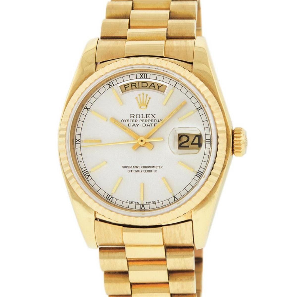 One Mens Quickset Rolex Day Date 18K Yellow Gold President Polished, Serviced & Electronically Tested, 18K Yellow Gold Case: 36mm, 18K Yellow Gold Crown, Bezel: 18K Yellow Gold Fluted Bezel. Custom Crystal: New Scratch Resistant Synthetic Sapphire Cyclops Lens. Custom Hands: New Luminescent Hands. This Watch Has Been Serviced Time Tested And Is In Excellent Condition It Is Free Of All Scratches And Dents. Movement: Automatic Quickset Winding Movement Caliber 3055. Custom Dial: Silver Index With Roman Track & Lumi Dots. Date Window: 3 O'Clock Position, Day Display: 12 O'Clock Position, Single Quickset, Model: Day Date President. Condition: G-6 Extra Fine. Bracelet: 18K Yellow Gold President Band With Hidden Clasp, Bright & Satin Polish. 7.0 Inch Length, Standard President Clasp, With Rolex Logo. This Watch Comes With A Rolex Box & Appraisal.