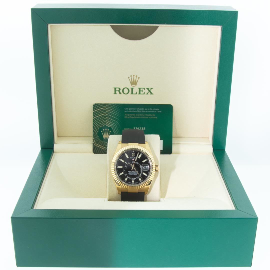One Mens Pre Owned 18K Yellow Gold Rolex Sky Dweller With Date Polished, Serviced & Electronically Tested, Rolex 18K Yellow Gold Case: 42mm, Rolex Yellow Gold Crown, Rolex Bezel: 18K Yellow Gold Rotatable Fluted Bezel. Rolex Crystal: Sapphire With Magnified Date Window. Rolex Movement: Automatic Winding Movement Caliber 9001. Rolex Dial: Rolex Black Sky Dweller Dial with Luminous Index Hour Markers. Date Window: 3 O'Clock Position Date Display, Model: Sky Dweller, Quickset, Month Calendar Feature, Dual Time, 72 Hour Power Reserve, Condition: G-6 Extra Fine. Rolex Bracelet: Rubber Oyster Flex Band. 7.25 Inch Length, Standard Clasp, With Rolex Logo. This Watch Has Been Serviced Time Tested And Is In Excellent Condition It Is Free Of All Scratches And Dents. This Watch Comes With Rolex Box And Papers.