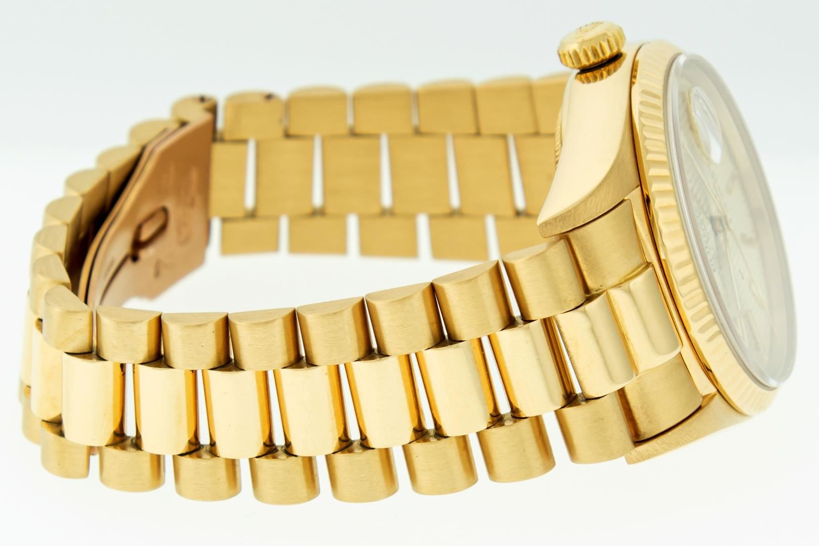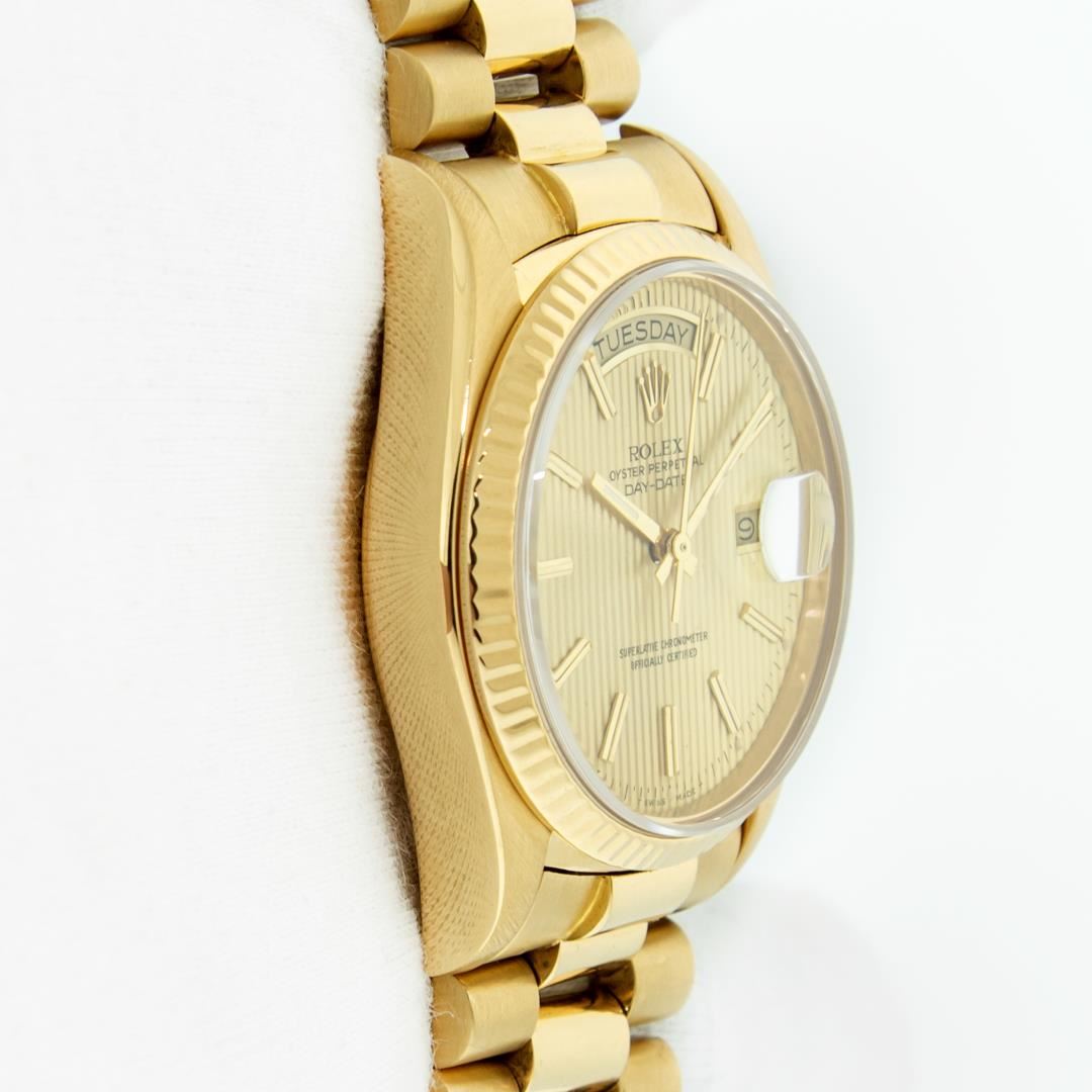 One Mens Pre Owned Quickset Rolex Day Date 18K Yellow Gold President Polished, Serviced & Electronically Tested, Rolex 18K Yellow Gold Case: 36mm, Rolex 18K Yellow Gold Crown, Rolex Bezel: 18K Yellow Gold Fluted Bezel. Crystal: Sapphire With Cyclops Lens. Rolex Movement: Automatic Quickset Winding Movement Caliber 3055. Rolex Dial: Factory Champagne Tapestry Index Dial With Dash Track. Date Window: 3 O'Clock Position, Day Display: 12 O'Clock Position, Single Quickset, Model: Day Date President. Condition: G-6 Extra Fine. Rolex Bracelet: 18K Yellow Gold President Band With Hidden Clasp, Bright & Satin Polish. 7.0 Inch Length, Standard President Clasp, With Rolex Logo. This Watch Comes With A Rolex Box.