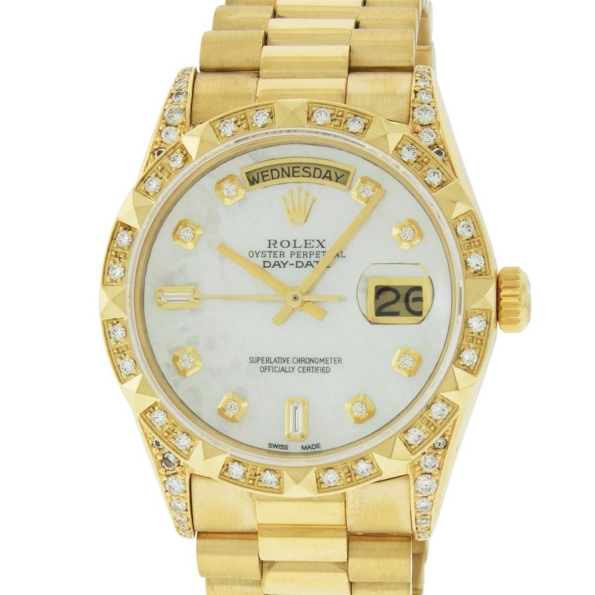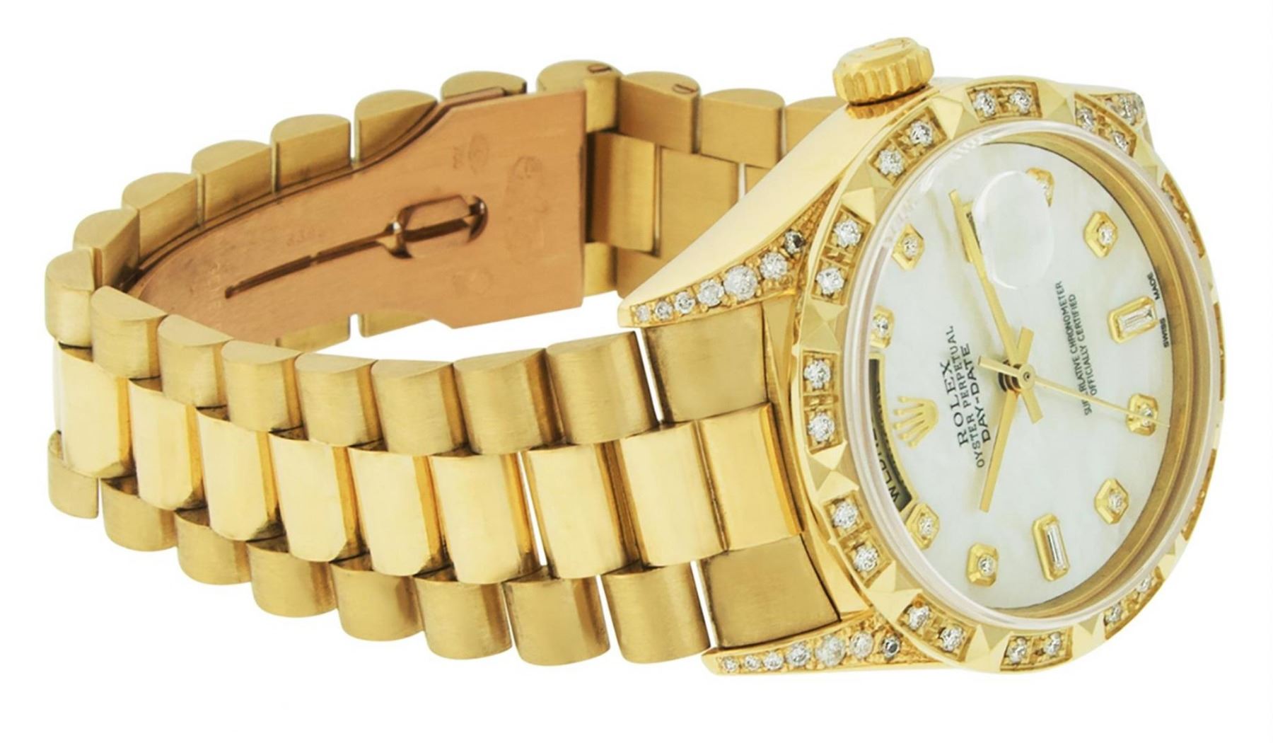 One Mens Rolex Day Date 18K Yellow Gold President Polished, Serviced & Electronically Tested, 18K Yellow Gold Case: 36mm, Custom Diamond Lugs: 28 Diamonds On Lugs, Color: G to H, Clarity: SI-VS. 18K Yellow Gold Crown, Custom Bezel: 18K Yellow Gold Pyramid Diamond Bezel, Diamond Count: 24 Diamonds On Bezel. Total Bezel Weight .75 Carat, Clarity: SI-VS, Color: G to H. Custom Crystal: New Synthetic Sapphire Cyclops Lens. Custom Hands: New Luminescent Hands. Movement: Automatic Winding Movement Caliber 3055. Custom Dial: Refinished Single Cut Mother Of Pearl 8 + 2 Baguette Diamond Dial, Diamond Count: 8 Diamonds + 2 Diamond Baguettes, Color: G to H, Clarity: SI-VS. Date Window: 3 O'Clock Position Date Display, Day Window: 12 O'Clock Position Date Display. Quickset, Model: Day Date President. Condition: G-6 Extra Fine The Watch Is In Very Good Condition Free Of All Scratches And Dents. Bracelet: 18K Yellow Gold President Band. Bright Polish. 6.75 Inch Length, Standard Hidden President Clasp President Band, With Rolex Logo. This Watch Comes With A Rolex Box, Appraisal.