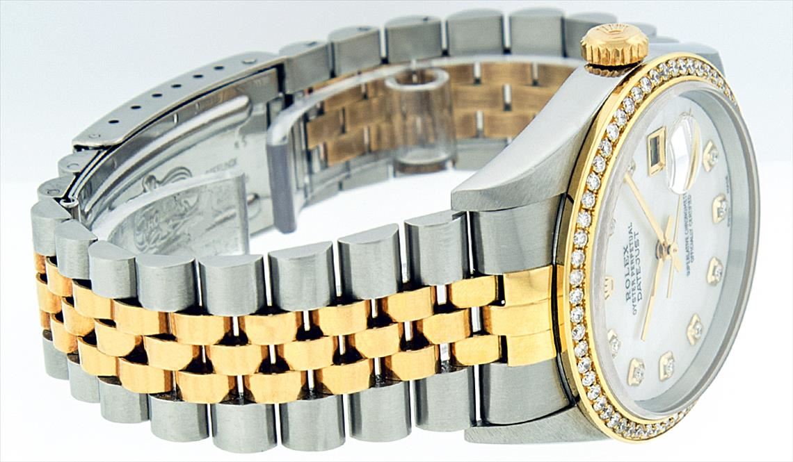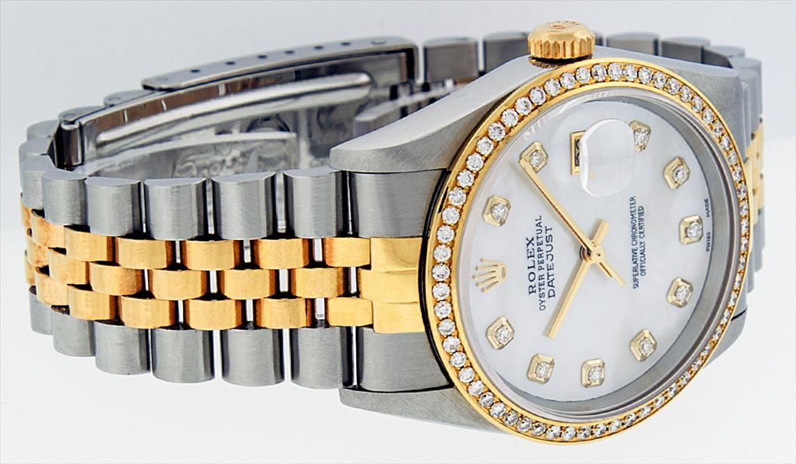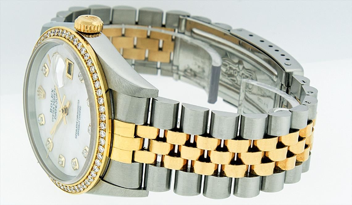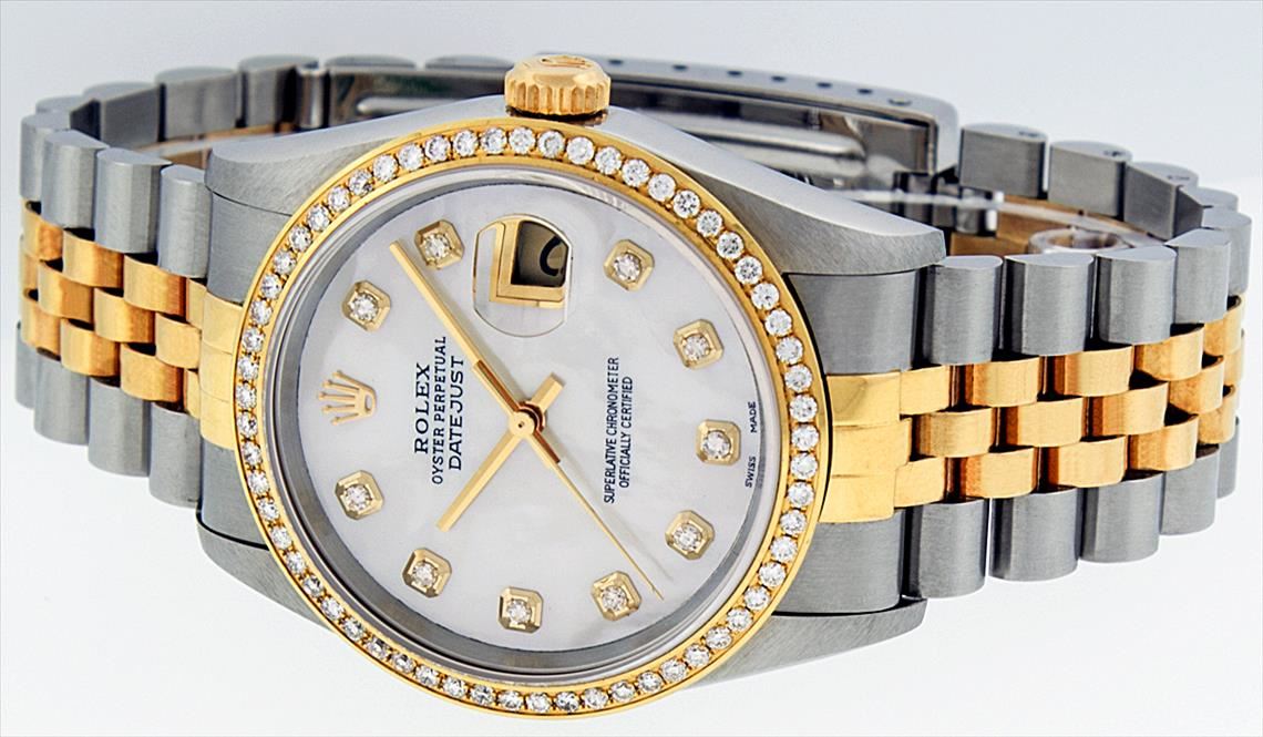 One Gents 18K Yellow Gold Two Tone Rolex Datejust Polished, Serviced & Electronically Tested, 18K Yellow Gold & Stainless Steel Case:36mm. Custom Bezel: 18K Yellow Gold Beadset Diamond Bezel, Diamond Count: 44 Diamonds. Total Weight 1.00 Carat, Clarity: Si-VS, Color: G to H. Custom Crystal: Synthetic Sapphire Cyclops Lens. Movement: Automatic Winding Movement Caliber 3135. Custom Dial: Mother Of Pearl Diamond Dial, Diamond Count: 10 Diamonds In Dial, Color: G To H, Clarity: SI-VS, Date Window: 3 O'Clock Position Date Display, Quickset, Model: 16233 Condition: G-6 Extra Fine The Watch Is In Very Good Condition Free Of All Scratches And Dents. Bracelet: Two Tone 18K Yellow Gold & Stainless Steel Jubilee Band. Bright Polish. 7.0 Inch Length, Adjustable. Standard Clasp, With Rolex Logo.