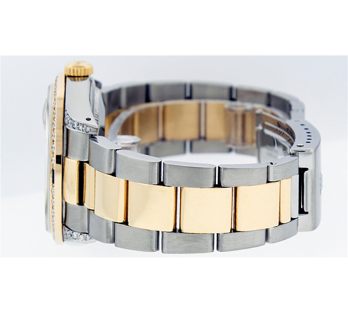 One Gents 18K Yellow Gold Two Tone Rolex Datejust Polished, Serviced & Electronically Tested, 18K Yellow Gold & Stainless Steel Case:36mm, Diamond Lugs On Case, Diamond Count: 16 Diamonds On Lugs, Color: G To H, Clarity: VVS. 18K Yellow Gold Crown, Custom Bezel: 18K Yellow Gold Sapphire Beadset Diamond Bezel, Diamond Count: 36 Diamonds + 4 Sapphires. Total Weight 1.00 Carat, Clarity: Si-VS, Color: G to H. Custom Crystal: Synthetic Sapphire Cyclops Lens. Movement: Automatic Winding Movement Caliber 3135. Custom Dial: Blue Vignette String Diamond Dial VVS, Diamond Count: 58 Diamonds In Dial, Color: G To H, Clarity: VVS, Date Window: 3 O'Clock Position Date Display, Quickset, Model: 16233 Condition: G-6 Extra Fine The Watch Is In Very Good Condition Free Of All Scratches And Dents. Bracelet: Two Tone 18K Yellow Gold & Stainless Steel Oyster Band. Bright Polish. 7.0 Inch Length, Adjustable. Standard Clasp, With Rolex Logo.