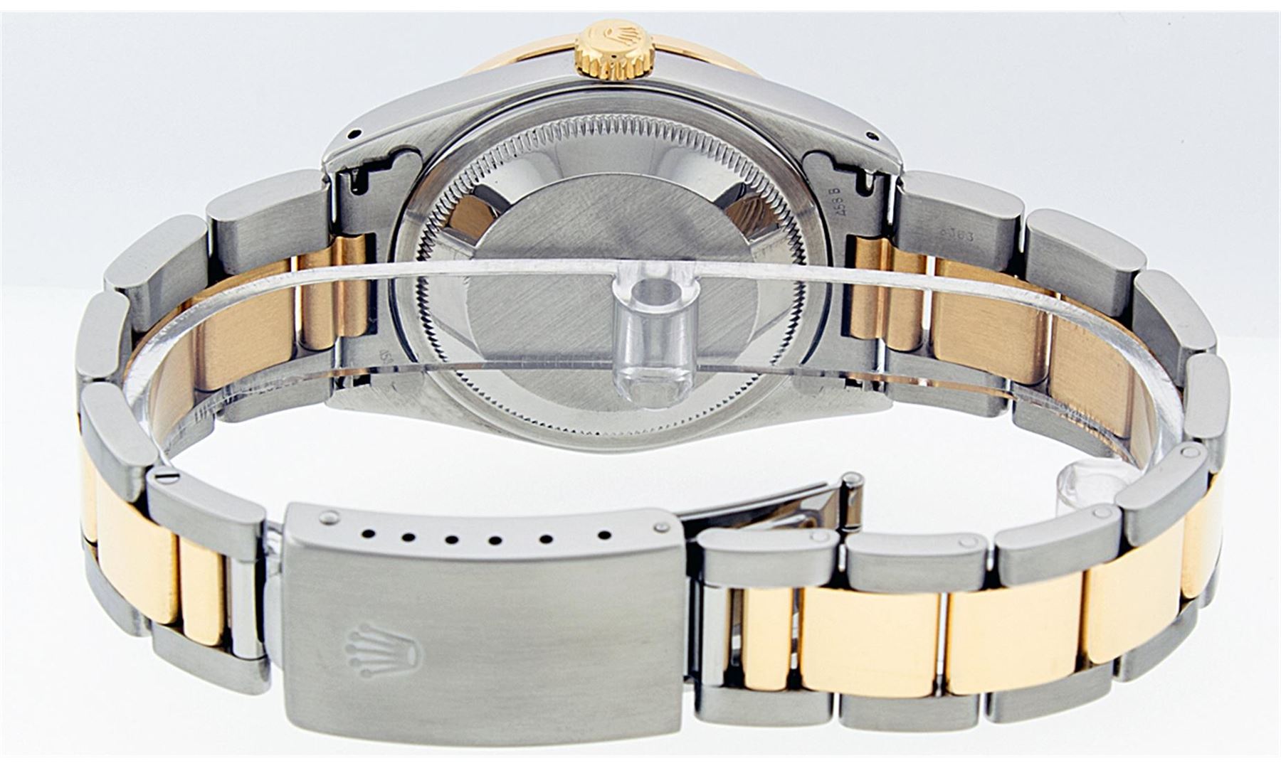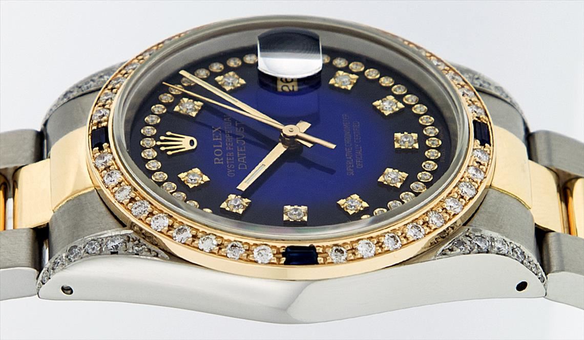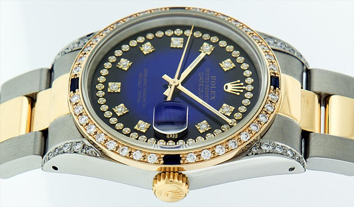 One Gents 18K Yellow Gold Two Tone Rolex Datejust Polished, Serviced & Electronically Tested, 18K Yellow Gold & Stainless Steel Case:36mm, Diamond Lugs On Case, Diamond Count: 16 Diamonds On Lugs, Color: G To H, Clarity: VVS. 18K Yellow Gold Crown, Custom Bezel: 18K Yellow Gold Sapphire Beadset Diamond Bezel, Diamond Count: 36 Diamonds + 4 Sapphires. Total Weight 1.00 Carat, Clarity: Si-VS, Color: G to H. Custom Crystal: Synthetic Sapphire Cyclops Lens. Movement: Automatic Winding Movement Caliber 3135. Custom Dial: Blue Vignette String Diamond Dial VVS, Diamond Count: 58 Diamonds In Dial, Color: G To H, Clarity: VVS, Date Window: 3 O'Clock Position Date Display, Quickset, Model: 16233 Condition: G-6 Extra Fine The Watch Is In Very Good Condition Free Of All Scratches And Dents. Bracelet: Two Tone 18K Yellow Gold & Stainless Steel Oyster Band. Bright Polish. 7.0 Inch Length, Adjustable. Standard Clasp, With Rolex Logo.