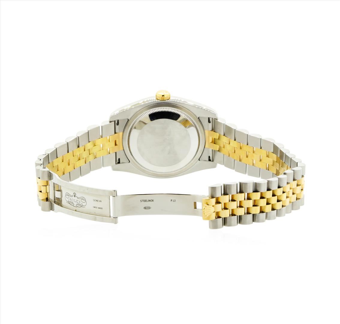 One gents, hand crafted & machine milled Rolex two-tone DateJust model wristwatch electronically tested, stainless steel Case: 37mm oyster, Rolex Signature Crown: twinlock with logo, 18KT yellow gold Bezel: fluted, Rolex Hallmarked Crystal: synthetic sapphire cyclops lens, Circa: 2008. Model Number 116233. Automatic Movement: superlative chronometer, Rolex signed Dial: Porcelain White color, with baton hands and raised diamond markers, Calendar: quick set, Bracelet: two-tone stainless steel & 18KT yellow gold jubilee, Condition: G-7Near Mint. Eight and one half inch length, adjustable. Rolex Hallmarked concealed clasp, with logo. Total Weight of Watch 142.61gm. This watch comes complete with original warranty card. AIG Appraised at $10,050.00.