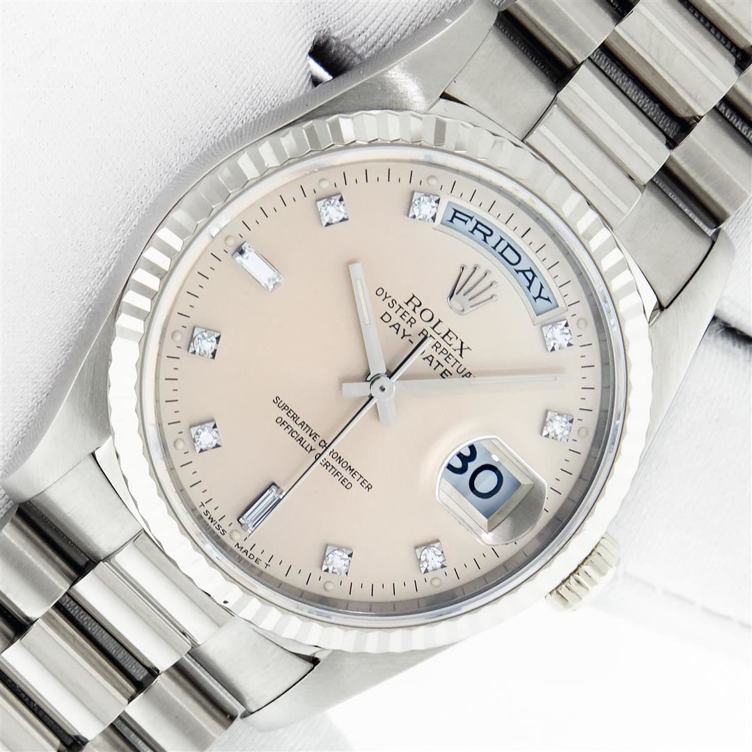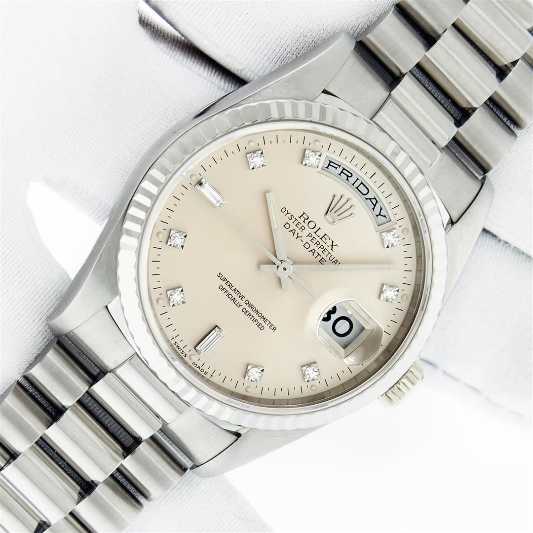 One Mens 18K White Gold Rolex President Day-Date Polished Bright with Satin Finish, Serviced & Electronically Tested, Case: 36mm, Crown with Rolex Logo, Original Bezel: Genuine Rolex 18K White Gold Fluted bezel, Crystal: Genuine Rolex Scratch Resistant Sapphire Crystal. Hands: Rolex 18k White Gold Luminous Hands. Movement: Officially certified chronometer automatic self-winding movement. Dial: Rolex Silver dial with diamond hour markers. Date Window: 3 O'Clock Position Date Display,12 o'clock Position Weekday Display, Model: President Day-Date. Condition: G-6 Extra Fine. Bracelet: Genuine Rolex 18k White Gold Presidential Bracelet. Bright Polish & Satin Finish. 7 Inch Length, Adjustable. Genuine Rolex 18K White Gold With Hidden Clasp with Rolex Logo. This Watch Has Been Serviced Time Tested And Is In Excellent Condition It Is Free Of All Scratches And Dents. This Watch Comes With Rolex Box & Watch Winder.
