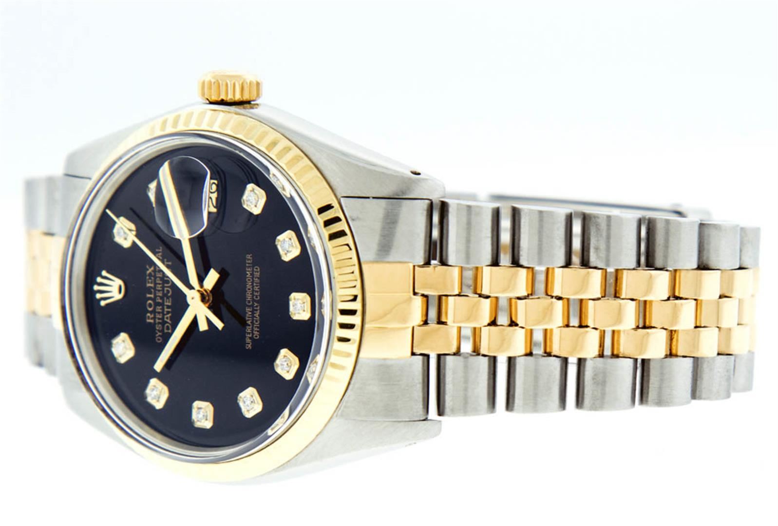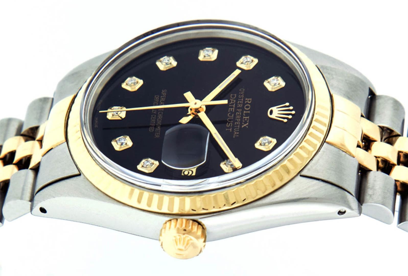 One Mens 14K Yellow Gold Two Tone Rolex Datejust Polished, Serviced & Electronically Tested, 14K Yellow Gold & Stainless Steel Case: 36mm, 14K Yellow Gold Crown, Bezel: 14K Yellow Gold Fluted Bezel. Custom Crystal: New Acrylic Cyclops Lens. Custom Hands: New Luminecent Hands. Movement: Automatic Winding Movement Caliber 3035. Custom Dial: Black Diamond Dial, Diamond Count: 10 Diamonds In Dial, Color: G to H, Clarity: SI-VS. Date Window: 3 O'Clock Position Date Display, Quickset, Model: 16013 Condition: G-6 Extra Fine. Bracelet: Two Tone 14K Yellow Gold & Stainless Steel Jubilee. Bright Polish. 7.0 Inch Length, Adjustable. Standard Clasp, With Rolex Logo. This Watch Has Been Serviced Time Tested And Is In Excellent Condition It Is Free Of All Scratches And Dents.